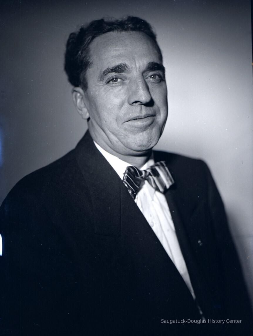 Middle-age man with dark hair, thick eyebrows, suit jacket and striped bowtie.