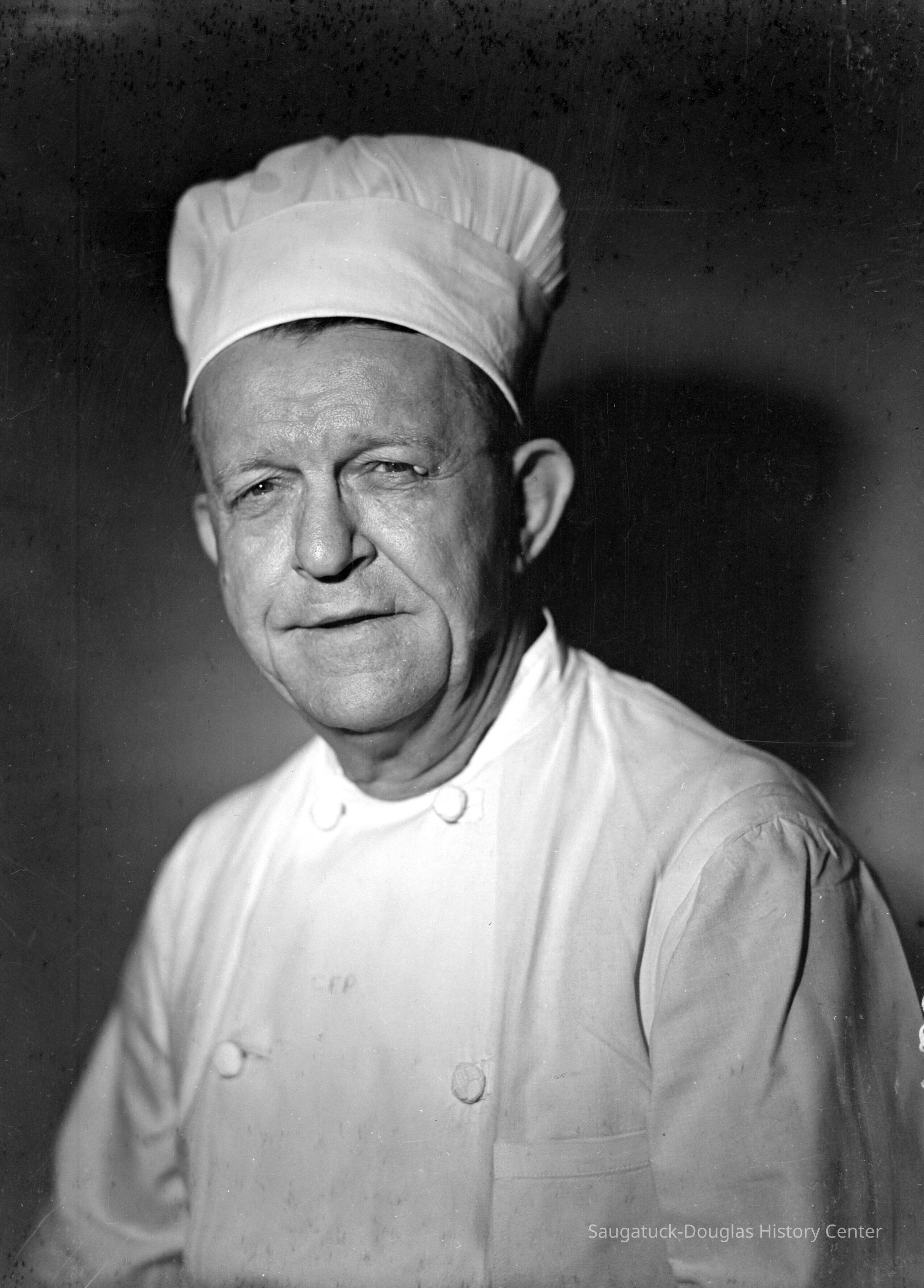 Also photo of unnamed middle-age man wearing chef's or cook's white uniform.