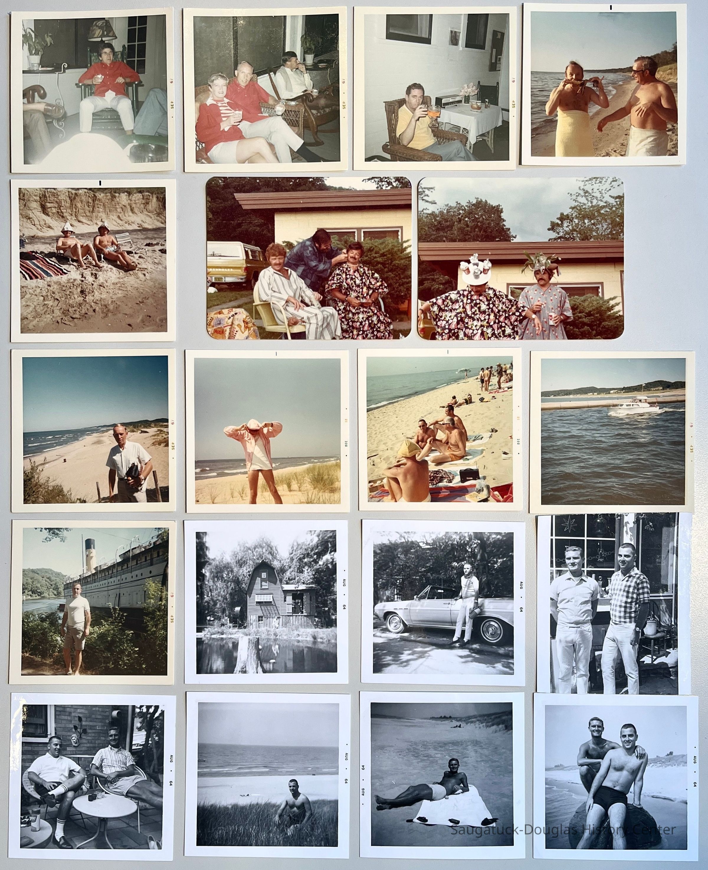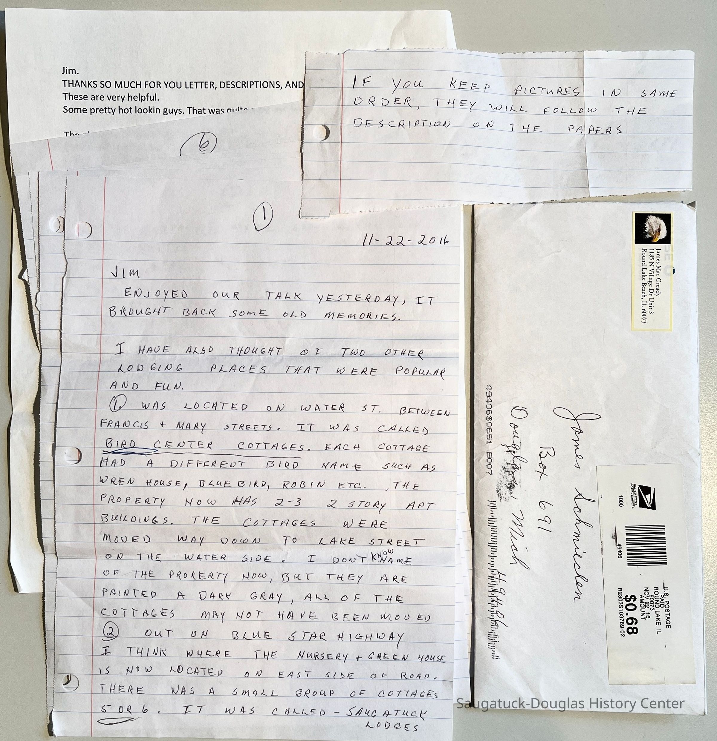 2. Six-page, handwritten letter from Jim Mac Cready to Jim Schmiechen, dated 11-22-2016. The letter begins with Mac Cready's recollections of fun and gay-friendly lodging including Bird Center Cottages and Saugatuck Lodges. Next, Mac Cready recounts the back stories of the photos including cocktail time at the Elms Hotel run by Frank Van Antelek in 1967; the tragic ends of Bob and Jim who owned The Bay; at a cottage's beach in Douglas; beach erosion in 1967-1968; 4th of July caftan and hat party at Lucy's Shady Shores Motel 1976; on the beach north of the Oval 1967; Keewatin 1967; Peterson Mill 1964; Jim MacCready in 1964; Country Store Antiques; Patio area of Corner House [Hidden Gardens] when owned by Jackson Saye in 1964.