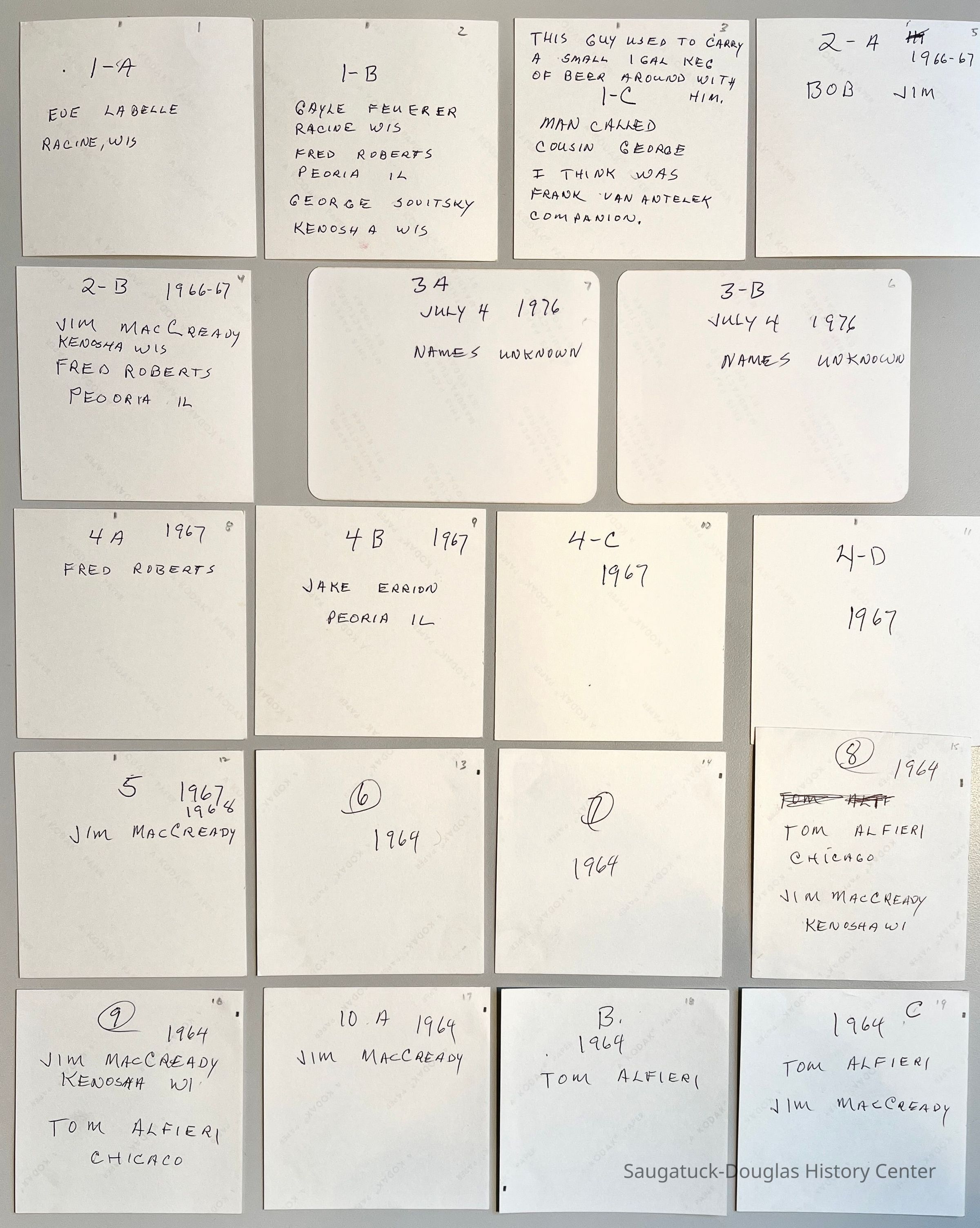 1-a Eve Labelle, Racine, Wis; 1-b Gayle Feuerer, Racine Wis, Fred Roberts, Peoria IL, George Sovitsky, Kenosha Wis; 1-c This guy used to carry a small 1 gal. keg of beer around with him. Man called Cousin George. I think was Frank Van Antelek companion.; 2-a 1966-67 Bob Jim; 2-b Jim Mac Cready Kenosha Wis, Fred Roberts Peoria IL; 3a and 3b July 4, 1976 Names Unknown; 4a 1967 Fred Roberts; 4b 1967 Jake Errion Peoria IL; 4-c 1967; 4-d 1967; 5 1967 1968 Jim MacCready; 6 1964; 7 1964; 8 1964 Tom Alfieri Chicago, Jim Mac Cready Kenosha WI; 9 1964 Jim Mac Cready Kenosha WI, Tom Alfieri Chicago; 10-a 1964 Jim MacCready; 13 1964 Tom Alfieri; C 1964 Tom Alfieri Jim MacCreadyCreate Date