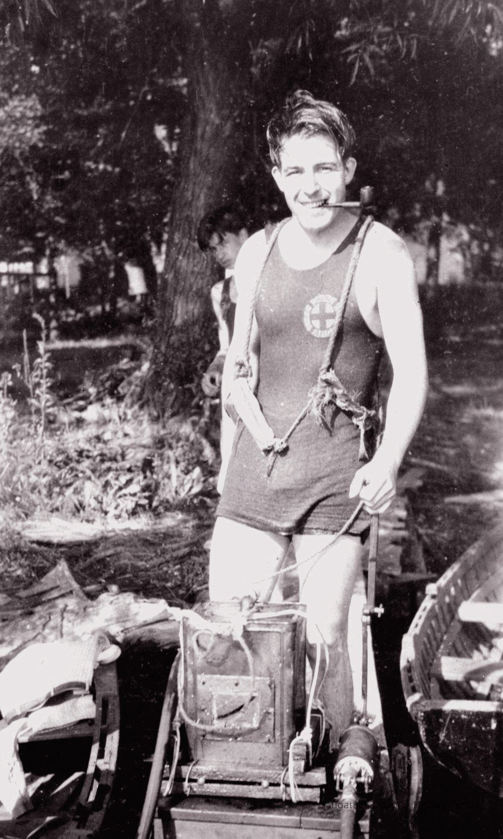 "Submarine Hiker / Youth at Saugatuck Invents Sea Hat with Which He Takes Leisurely Jaunt on Kalamazoo River Bottom."Photograph Details