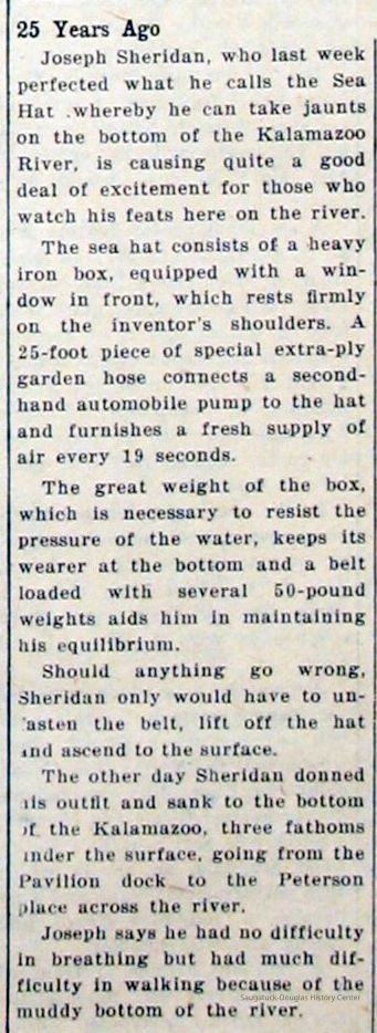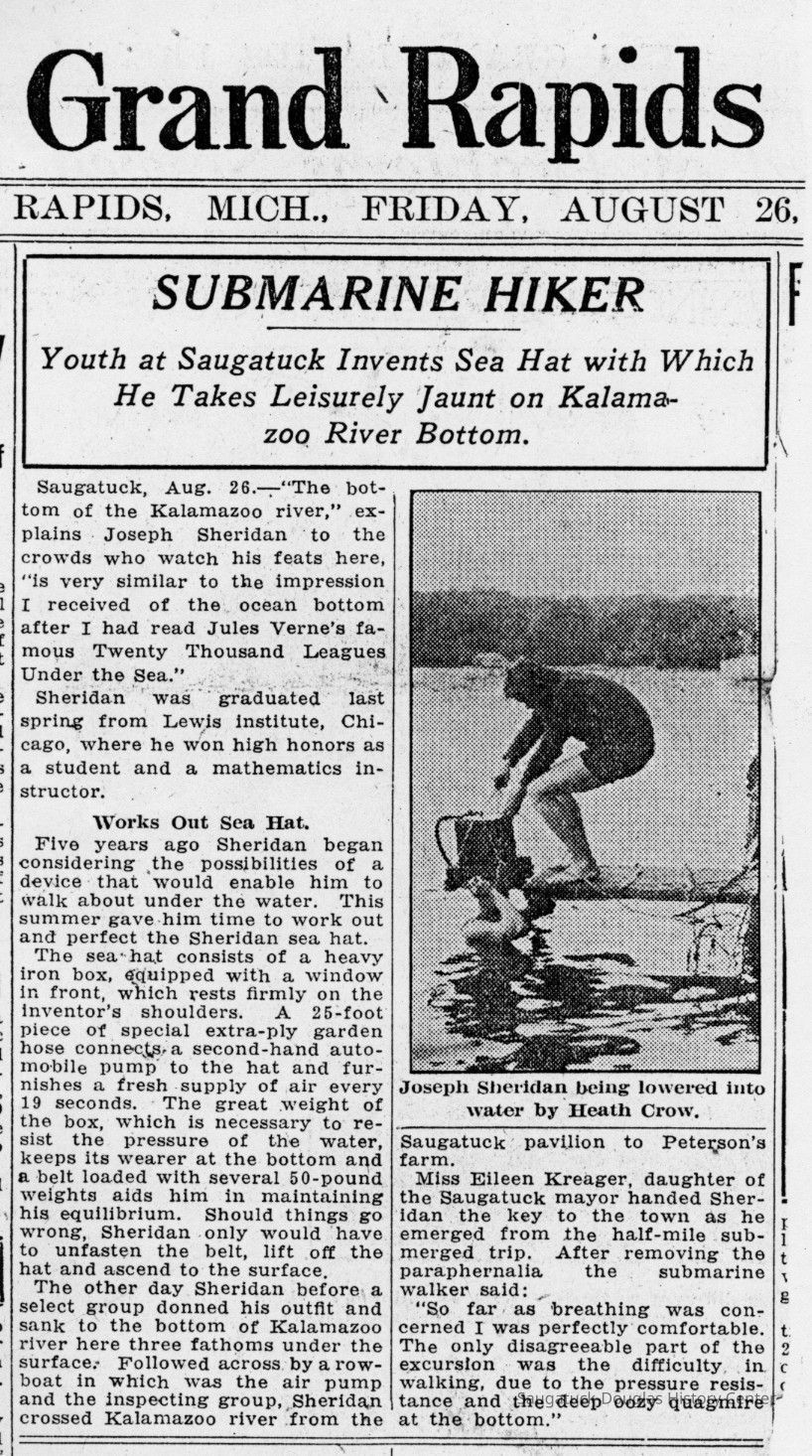 Grand Rapids Press newspaper clipping marked August 26, year unknown, of Joseph Sheridan's Sea Hat, an invention that used a bicycle pump to deliver air to a helmet worn by a person walking across the bottom of a lake.