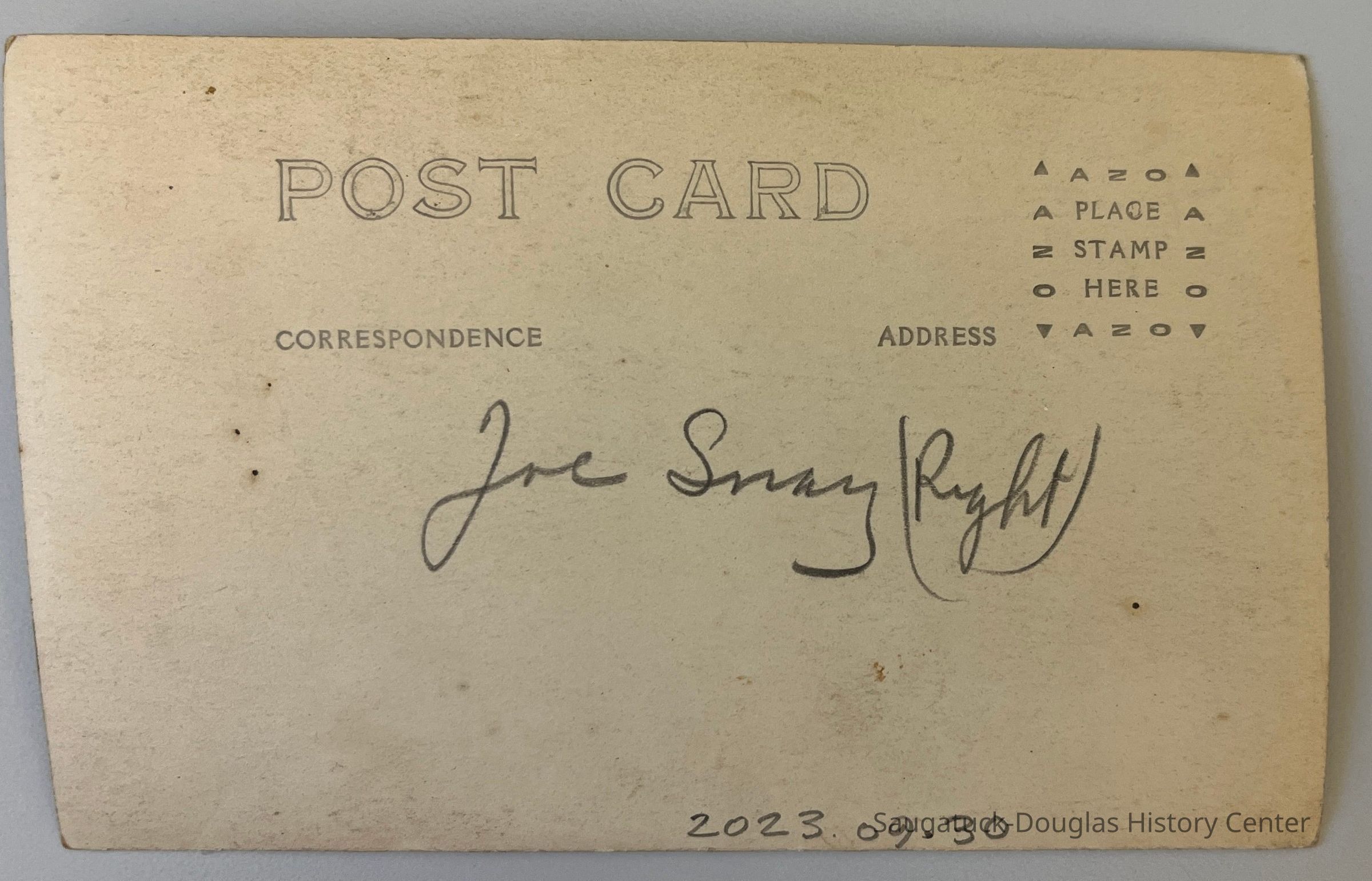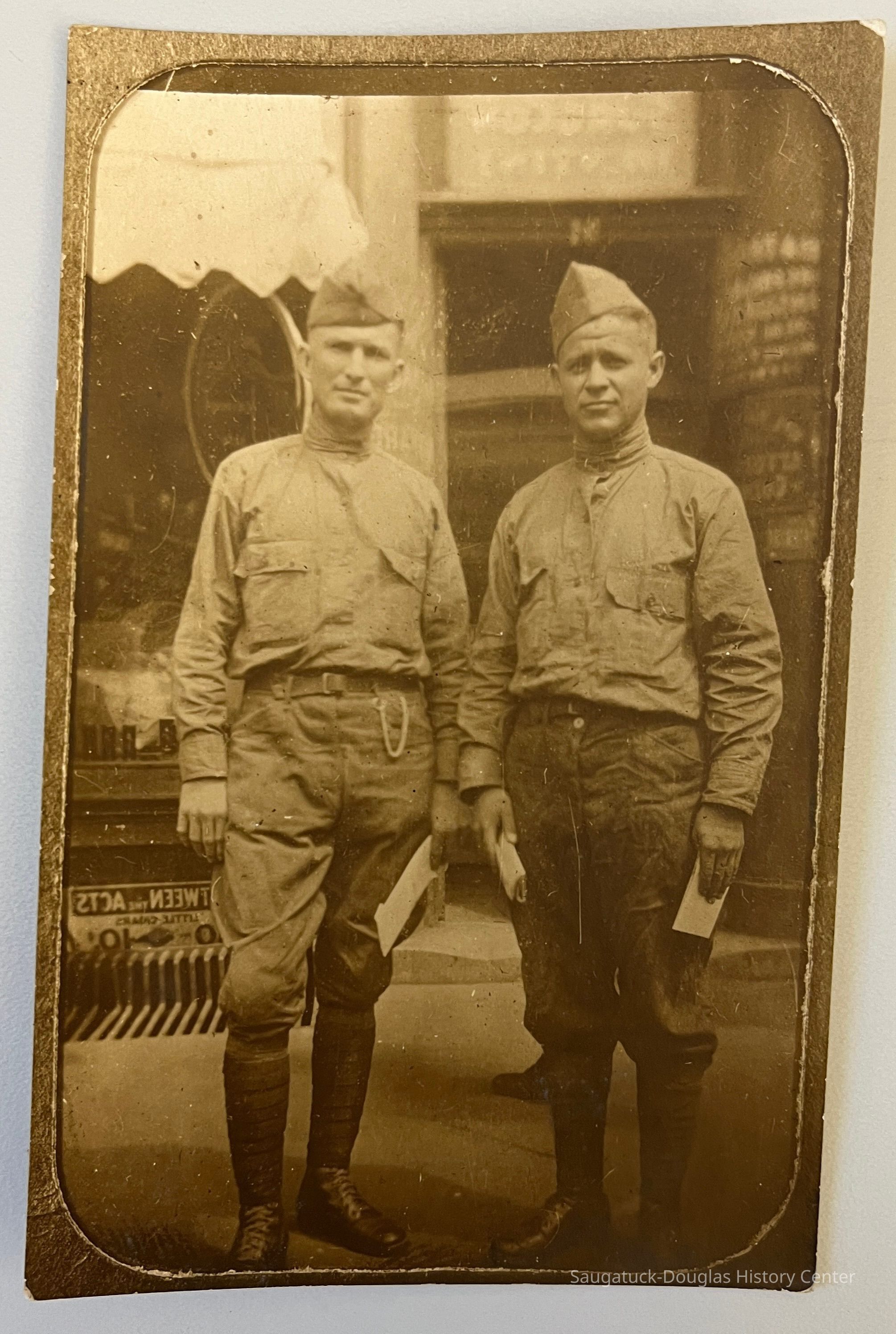 Real photo postcard of unknown man (at left) and Joseph F. Snay (at right) dressed in World War I uniforms of side (garrison) caps, high collared shirts and trousers tucked into puttees (leg wraps or gaiters). The men are holding envelopes and posed in front of a shop. A sign in the lower corner of the photo suggests that the negative was backwards when the image was printed.Photograph Details