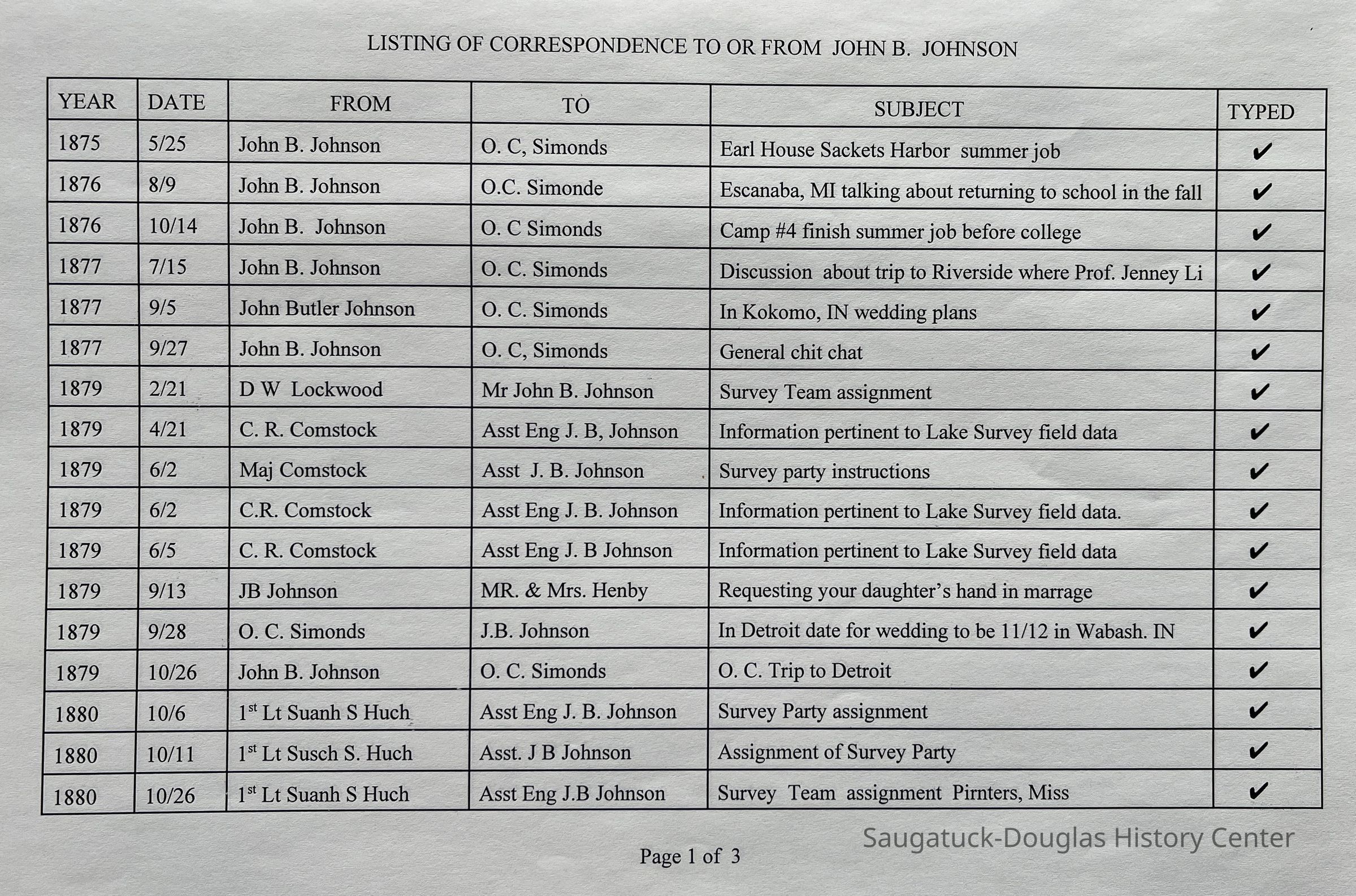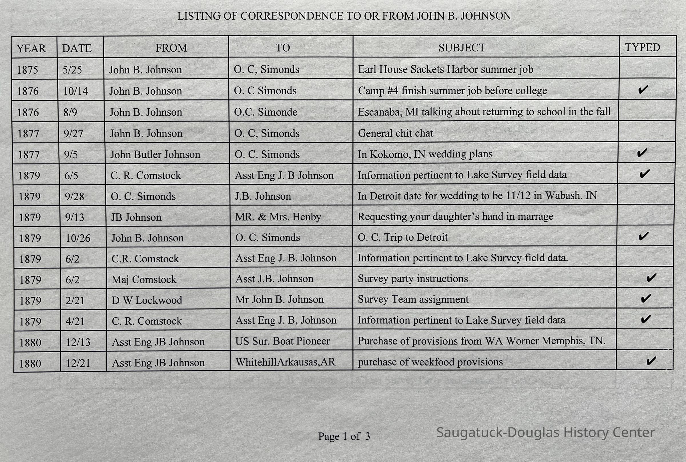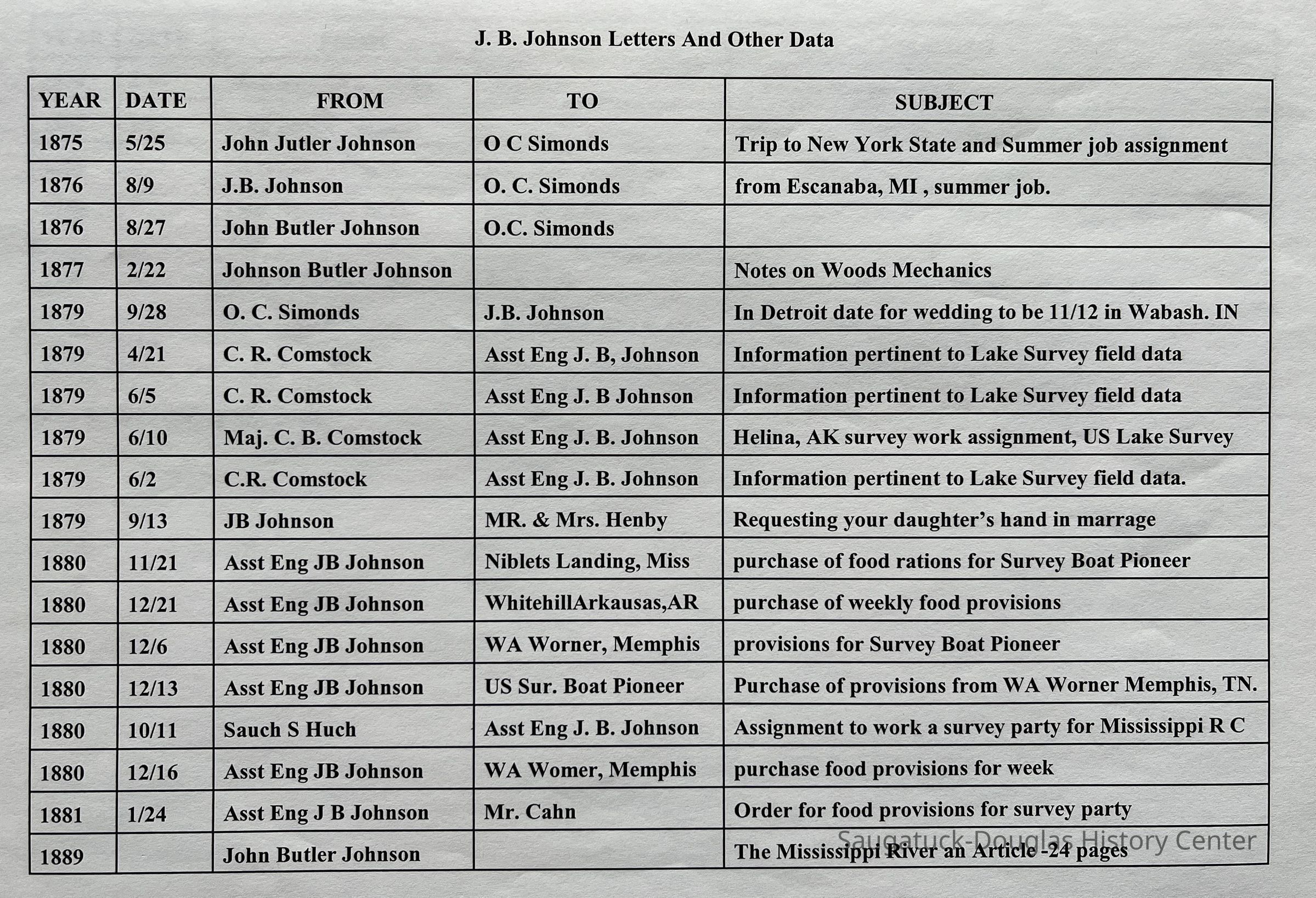 3-ring binder filled with letters and typed transcriptions of correspondence between John Butler Johnson and O.C. Simonds, D.W. Lockwood, C.R. Comstock, 1st Lt. Suanh S. Huch, A.E. Syanmes, the Mississippi River Comm, W.A. Worner, A.P. Berry & Co., Mr. & Mrs Henby (requesting their daughter's hand in marriage), his daughter Marjorie Daw Johnson and others. The letters date from 1875 until 1902, when John Butler was killed in a horse-and-wagon accident while traveling from Pier Cove to Fennville. Some envelopes are also included as well as provisions receipts and accounts for U.S. Survey Boat "Pioneer".