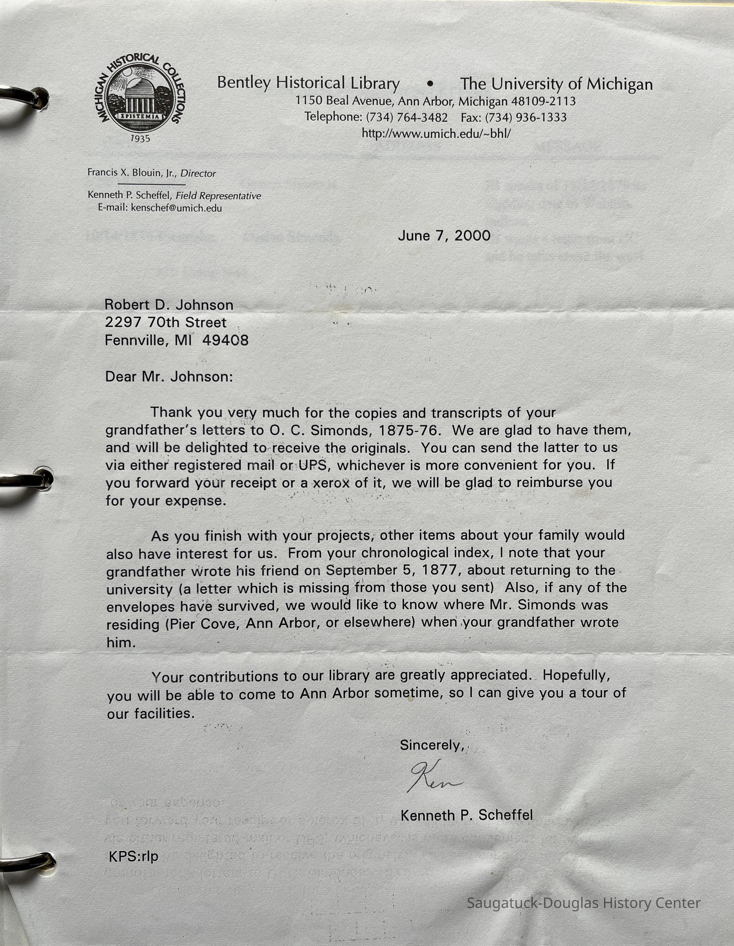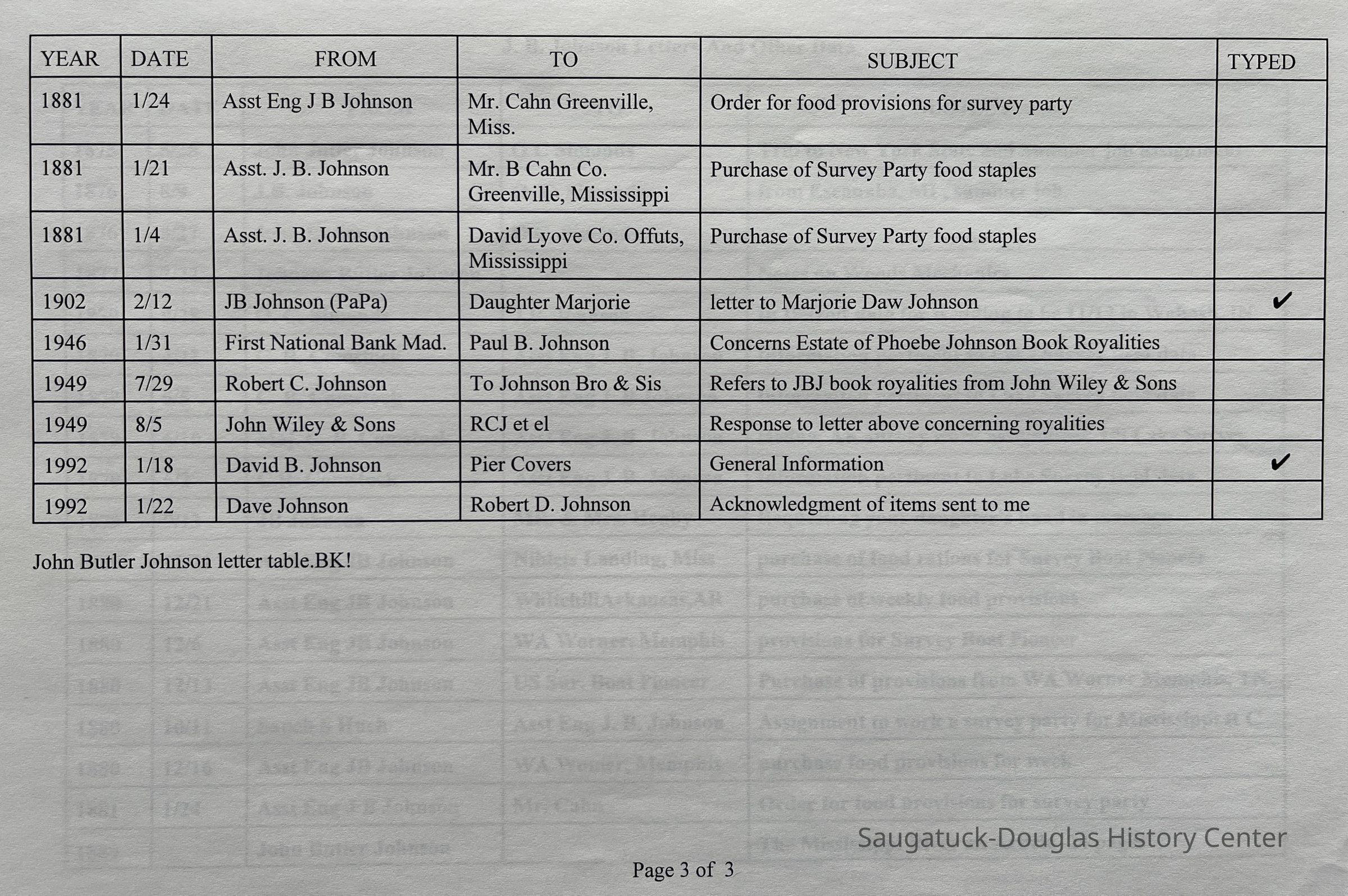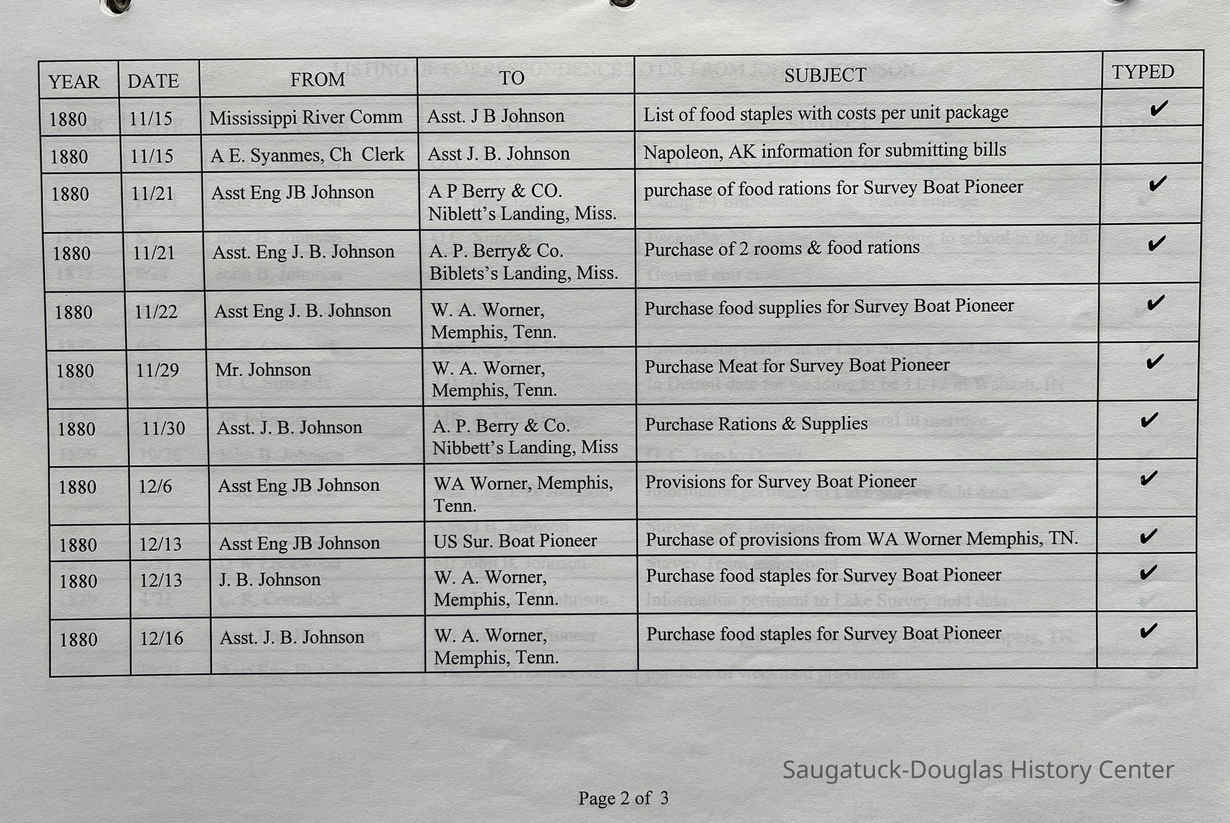 3-ring binder filled with letters and typed transcriptions of correspondence between John Butler Johnson and O.C. Simonds, D.W. Lockwood, C.R. Comstock, 1st Lt. Suanh S. Huch, A.E. Syanmes, the Mississippi River Comm, W.A. Worner, A.P. Berry & Co., Mr. & Mrs Henby (requesting their daughter's hand in marriage), his daughter Marjorie Daw Johnson and others. The letters date from 1875 until 1902, when John Butler was killed in a horse-and-wagon accident while traveling from Pier Cove to Fennville. Some envelopes are also included as well as provisions receipts and accounts for U.S. Survey Boat "Pioneer".