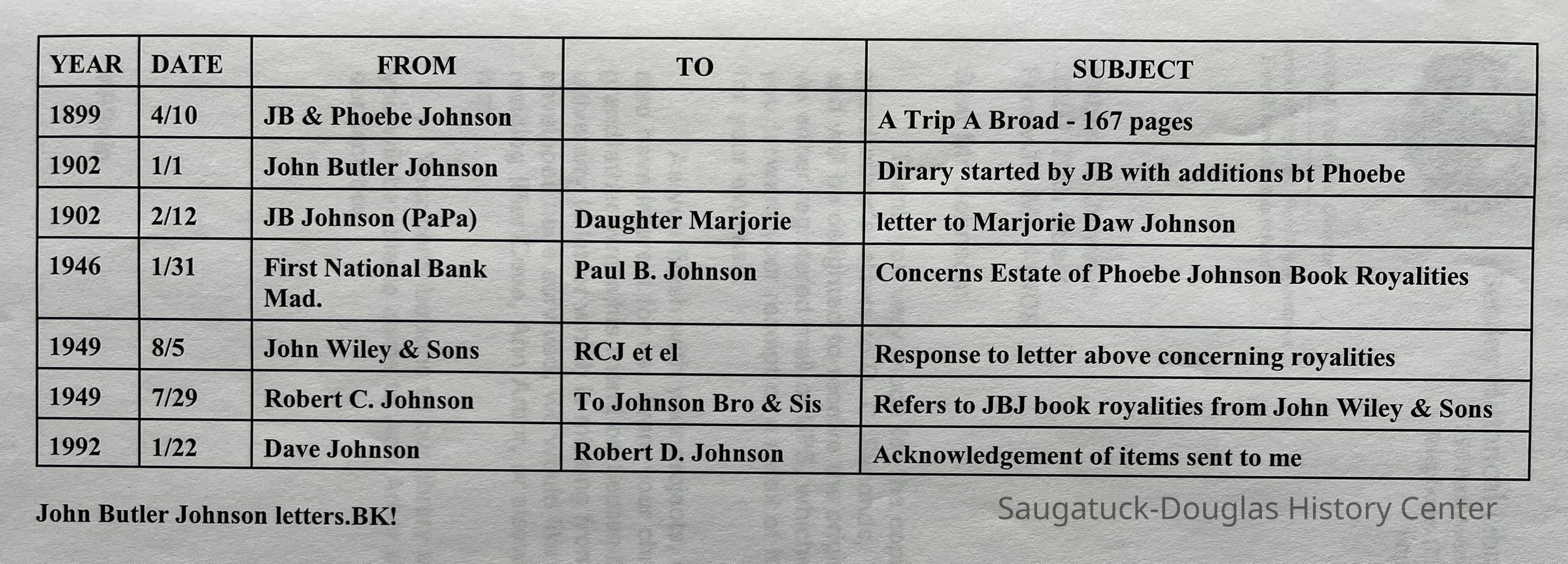 More recent Johnson family documents include a transcription of J.B Johnson's will, letters and articles of agreement about the Phoebe Johnson estate book royalties, letters to/from David B. Johnson, Robert C. Johnson and Paul B. Johnson.
