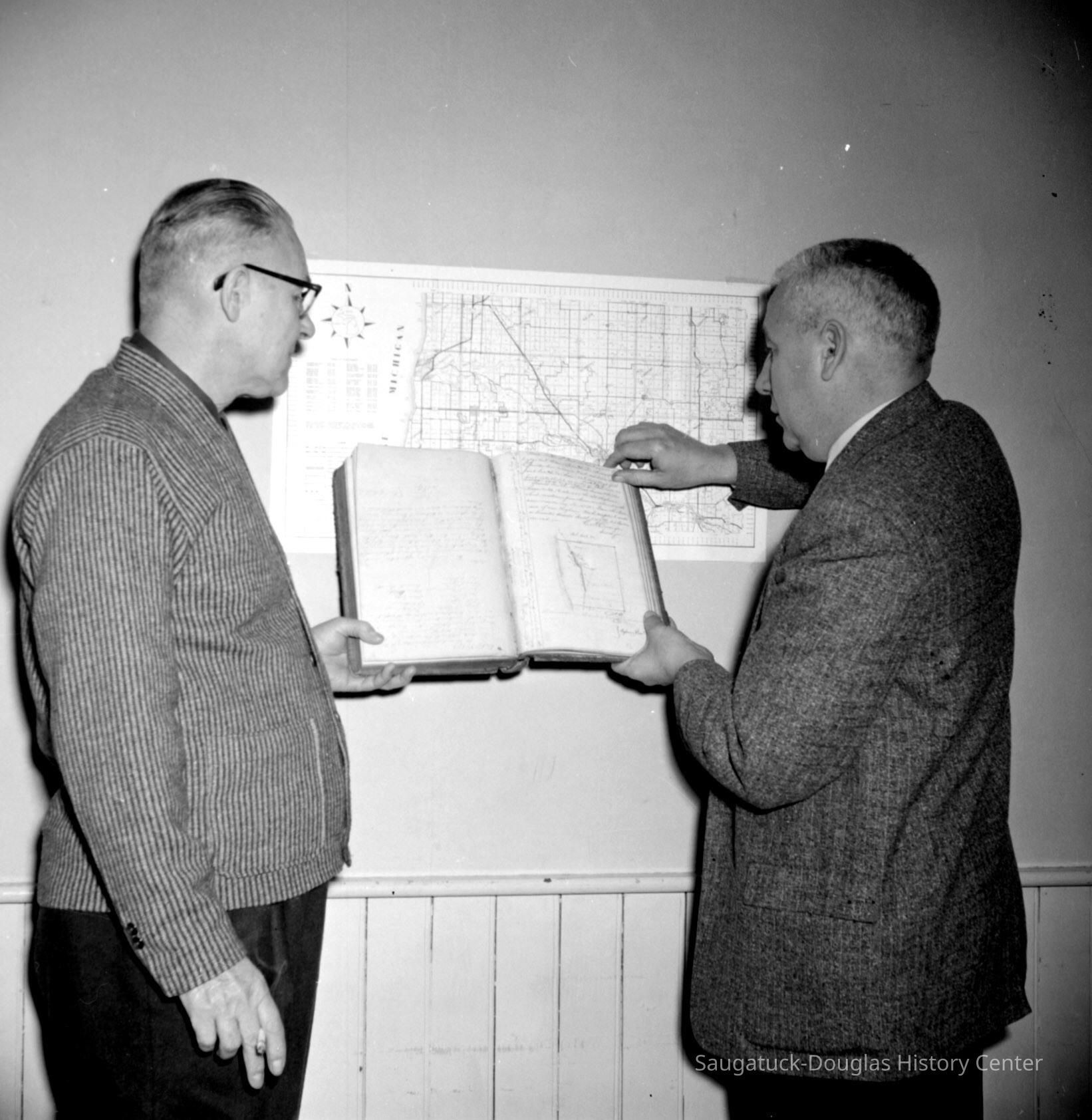 Two men examine a book, perhaps comparing it to a county map hung on the wall.