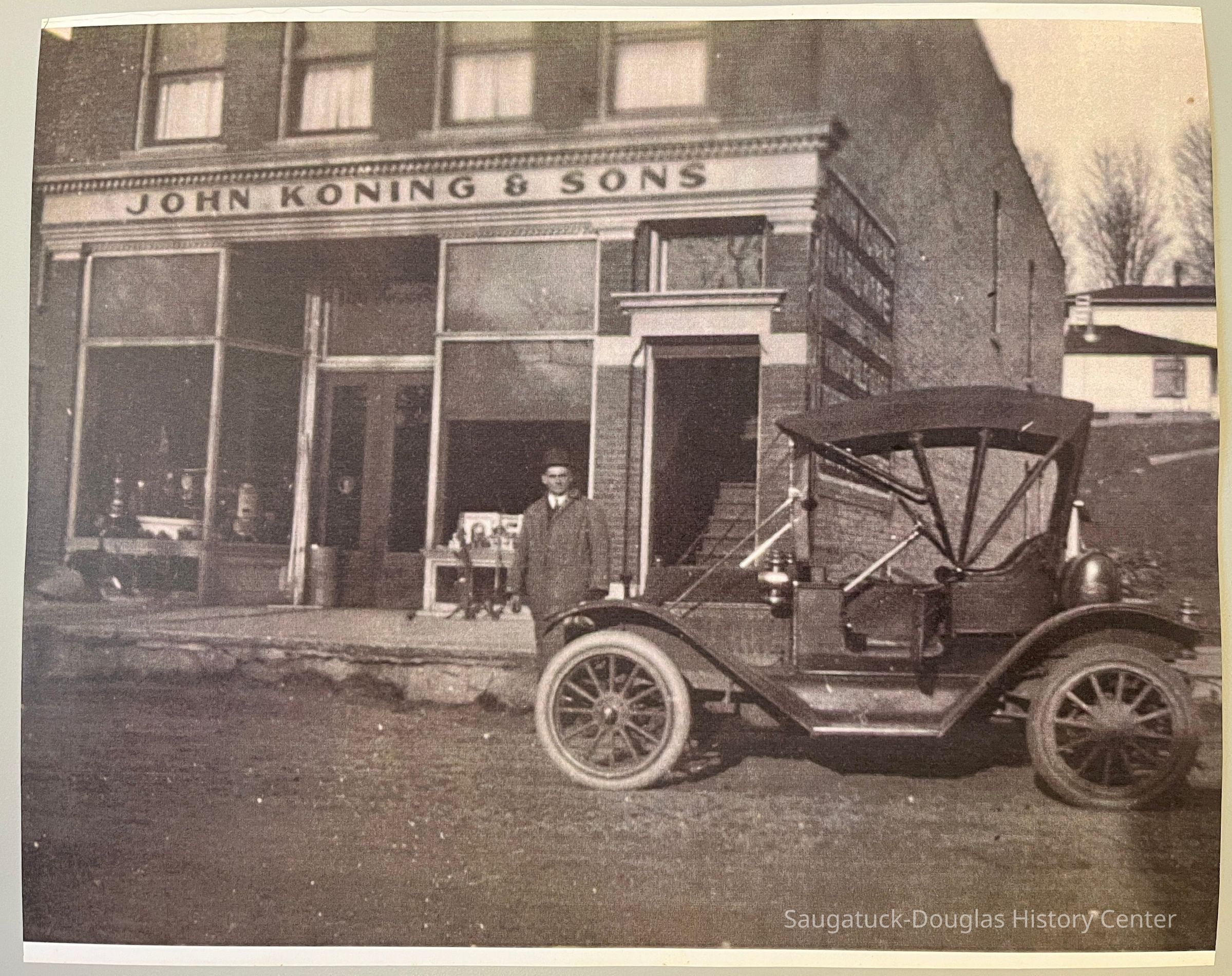 Black and white photograph of the front of the John Koning and Sons Hardware Store located on Butler Street. It shows a man wearing a coverall standing in front of the building next to a Model T type car.Photograph Details