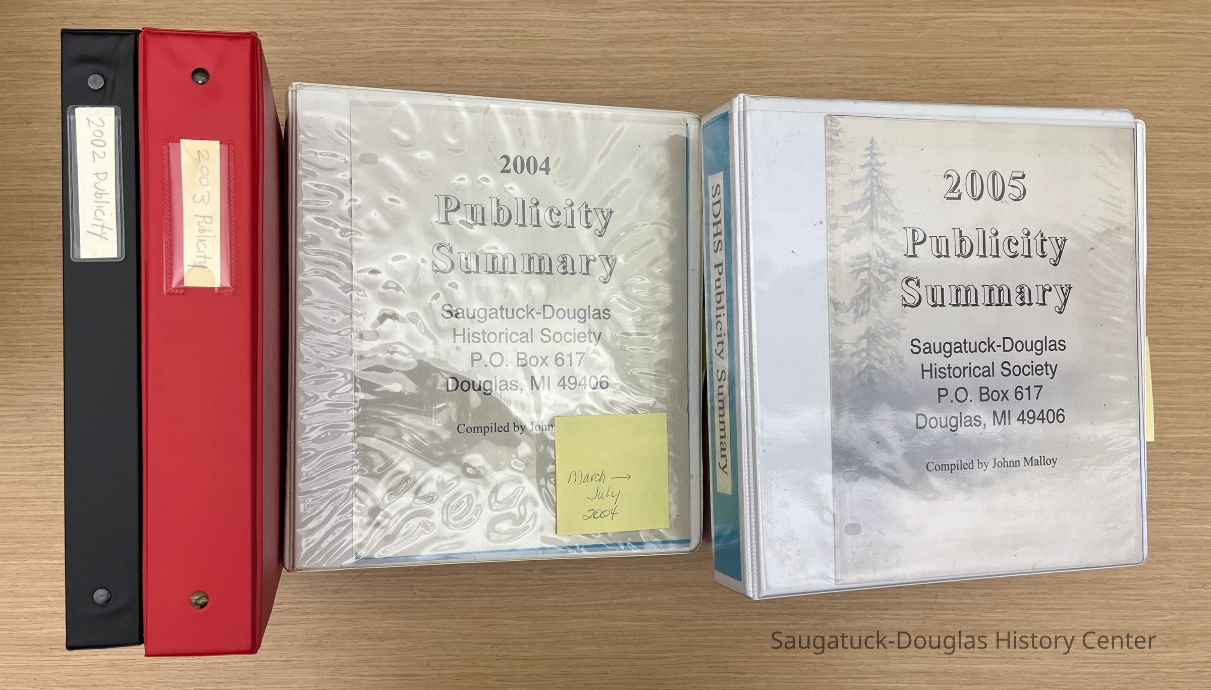 These binders, compiled by SDHS Communications/PR volunteer John Malloy, gives a week by week accounts of SDHC activities from 2003-2005. The 2002 binder is quite thin, yet each subsequent binder nearly doubles in size, indicating the increasing volume of Mr. Malloy's public relations efforts and SDHS activity.