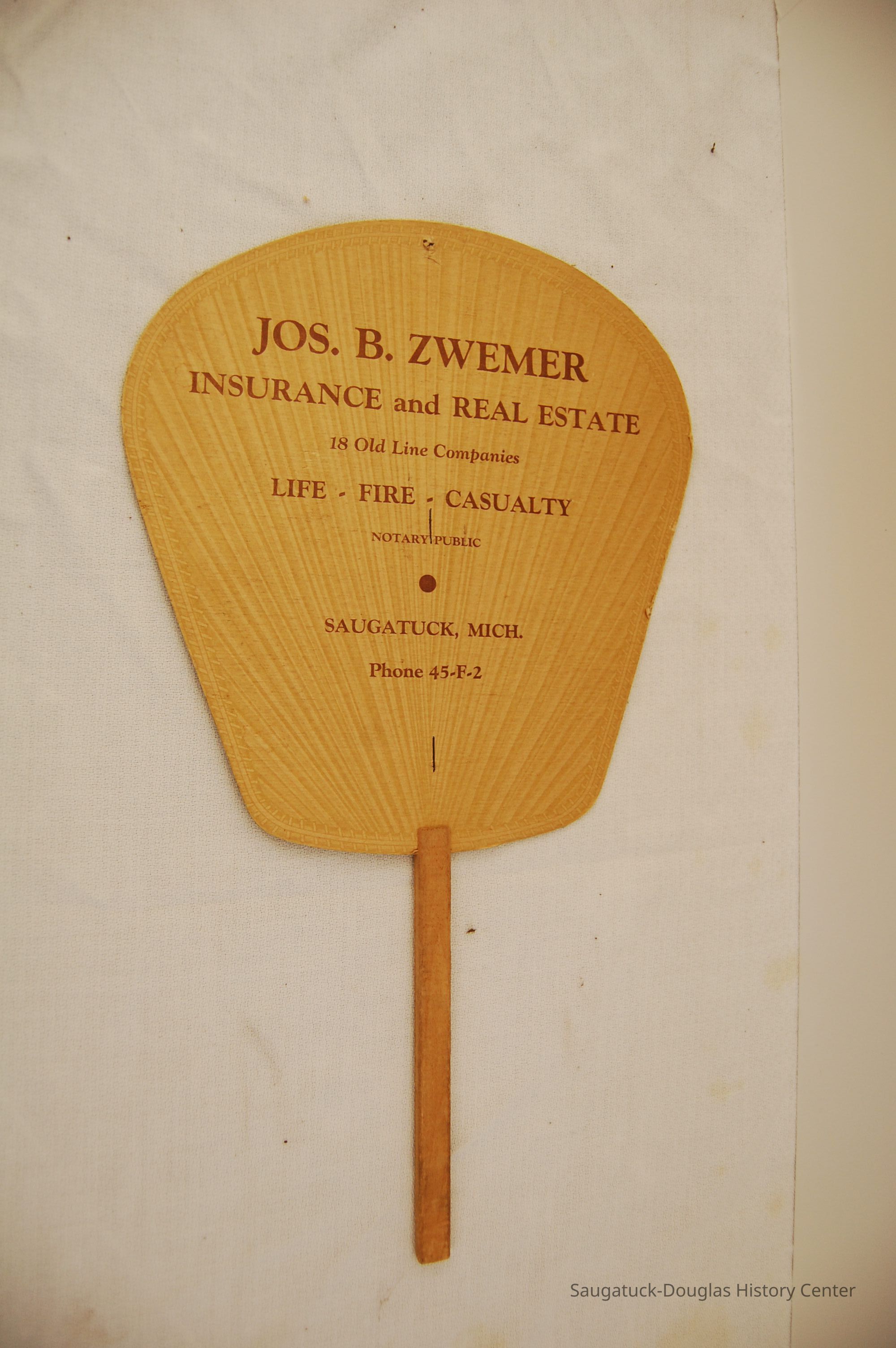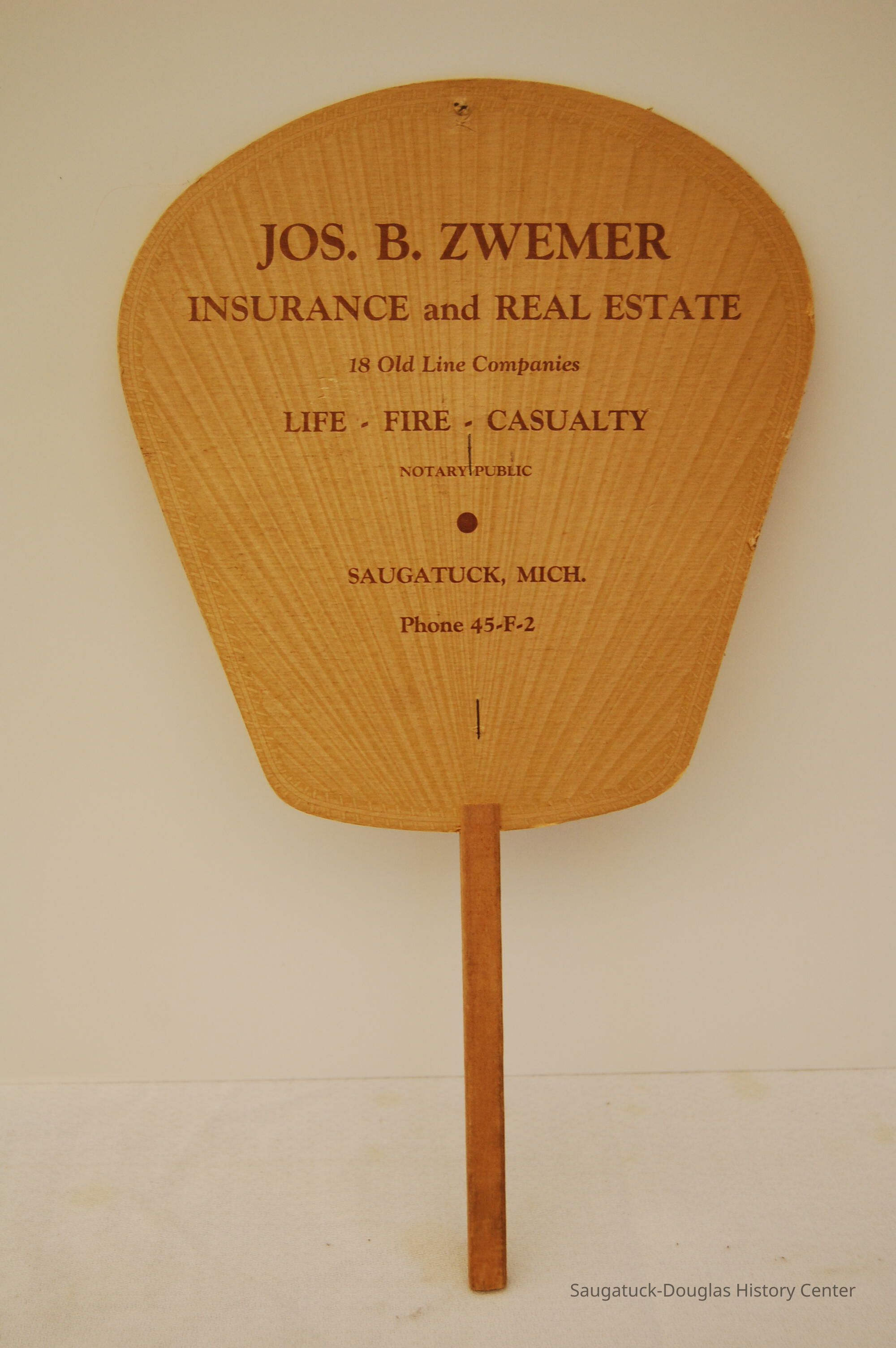 Handheld paper fan promoting Joseph B. ZwemerCollection