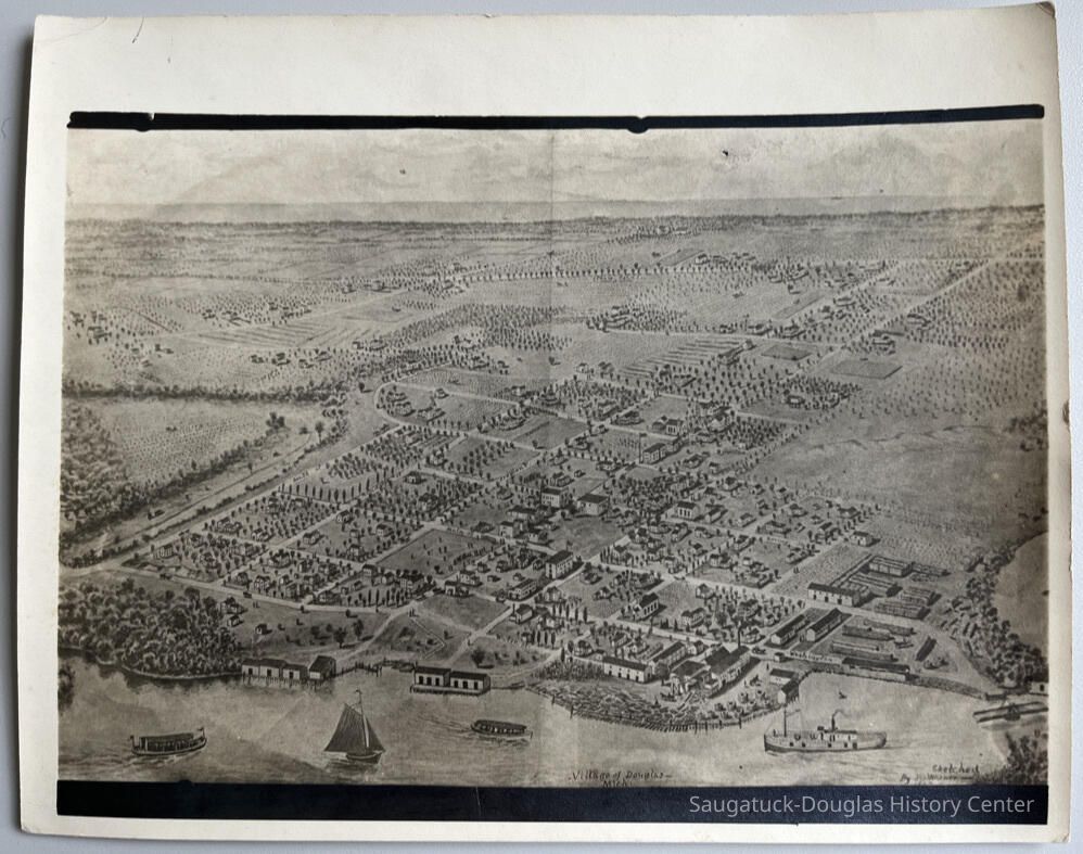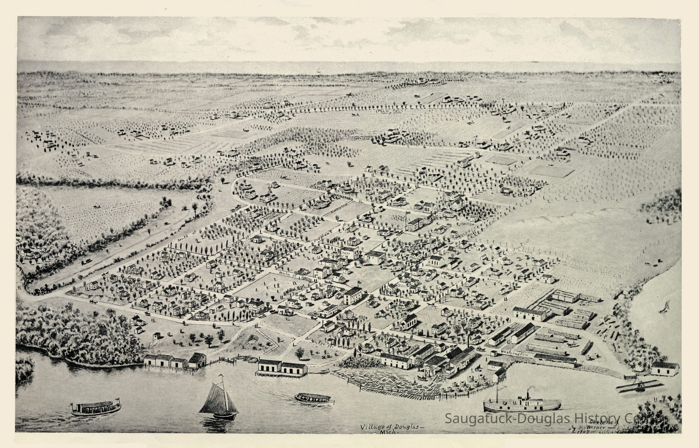 An aerial view of Douglas drawn in 1907. The fruit steamer near the swing bridge in the right hand corner is the J. S. Crouse. Boat on left may be a small steamer that made regular runs to New Richmond, other launch in middle of the picture is the ferry boat from Saugatuck and the West Shore.Create Date