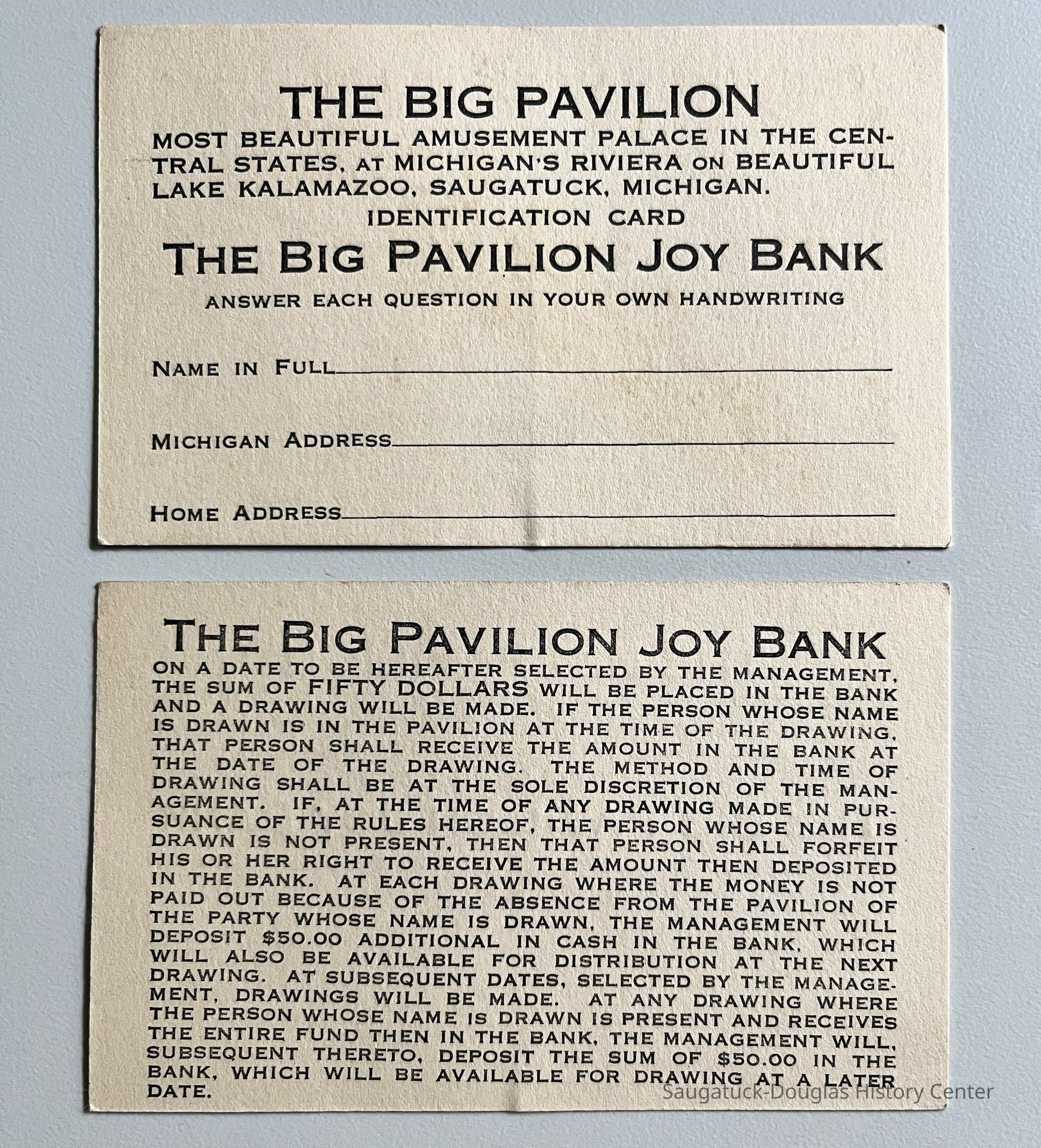 Two tickets for a $50 cash drawing held at the Big Pavilion. Winner had to be present when their name was called to receive the money.Context