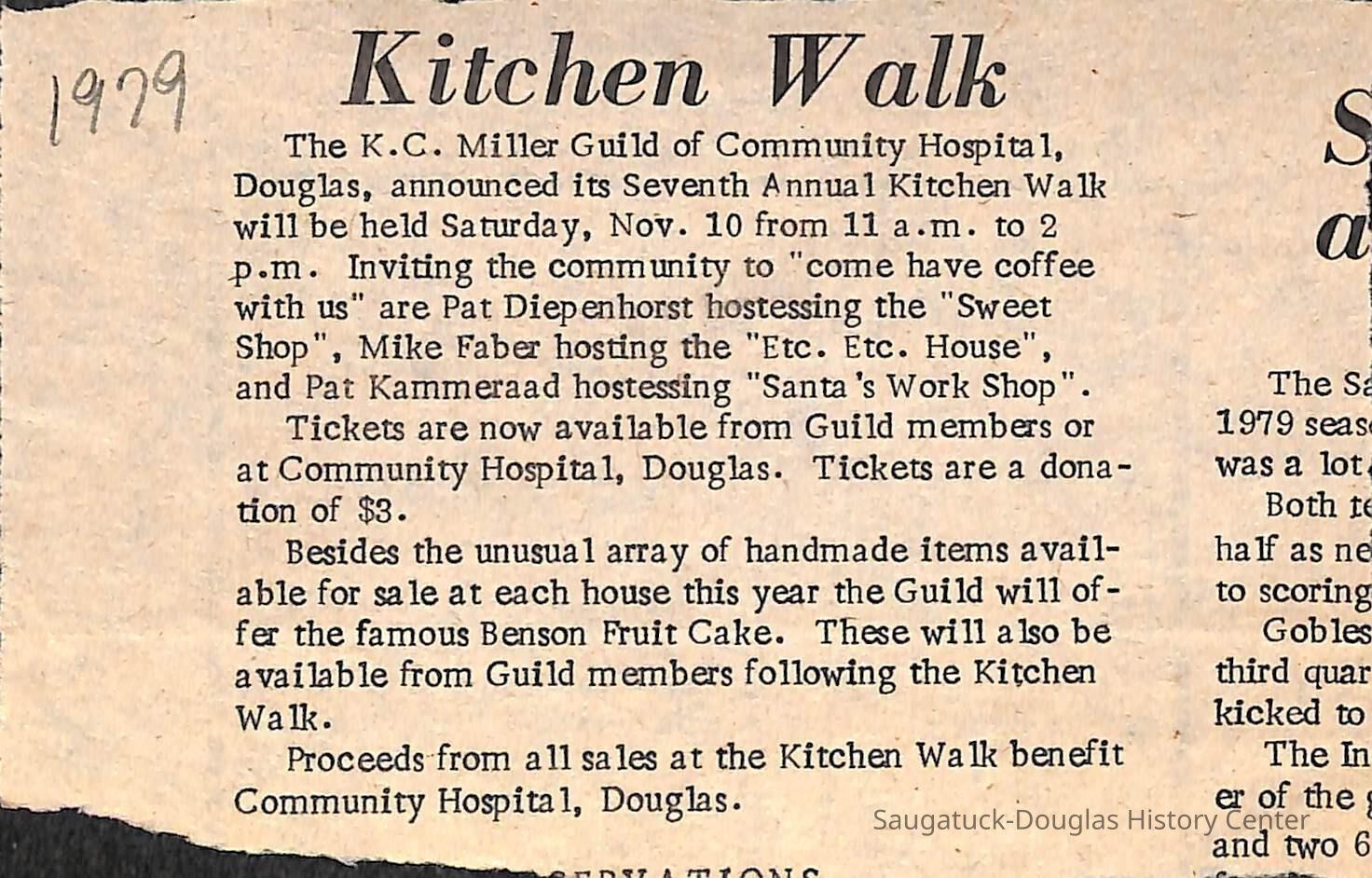 Collection of documents and photos related to the work of the K.C Miller Guild. They were a volunteer group that would do fundraising and put on events to support the Douglas Community Hospital. This collection contains two scrapbooks for the 1975 and 1976 Kitchen Walk. The books contain documents, articles, and photos. There are also multiple newspaper clippings of articles about the guild. And lastly, there are photos from the 1981 Thank You Dinner.