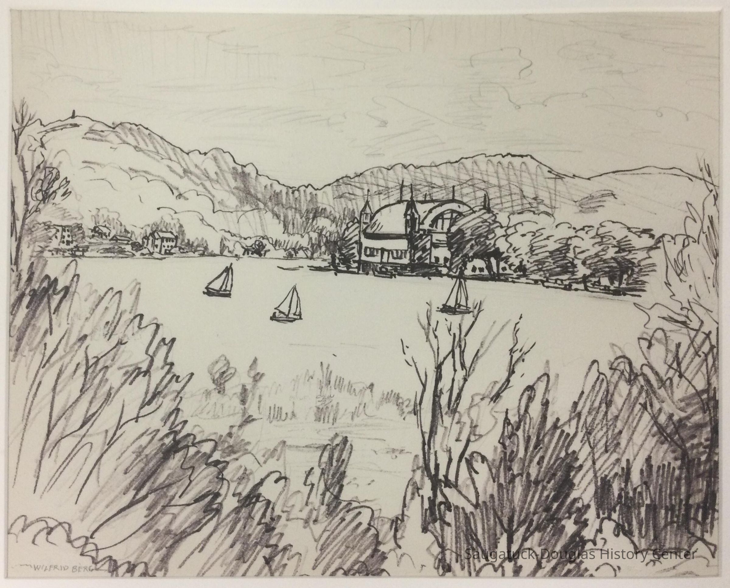 Big Pavilion from Douglas, looking across Kalamazoo Lake. If one looks closely, the artist has included color notations, indicating that this might have been a preliminary drawing for a later painting.