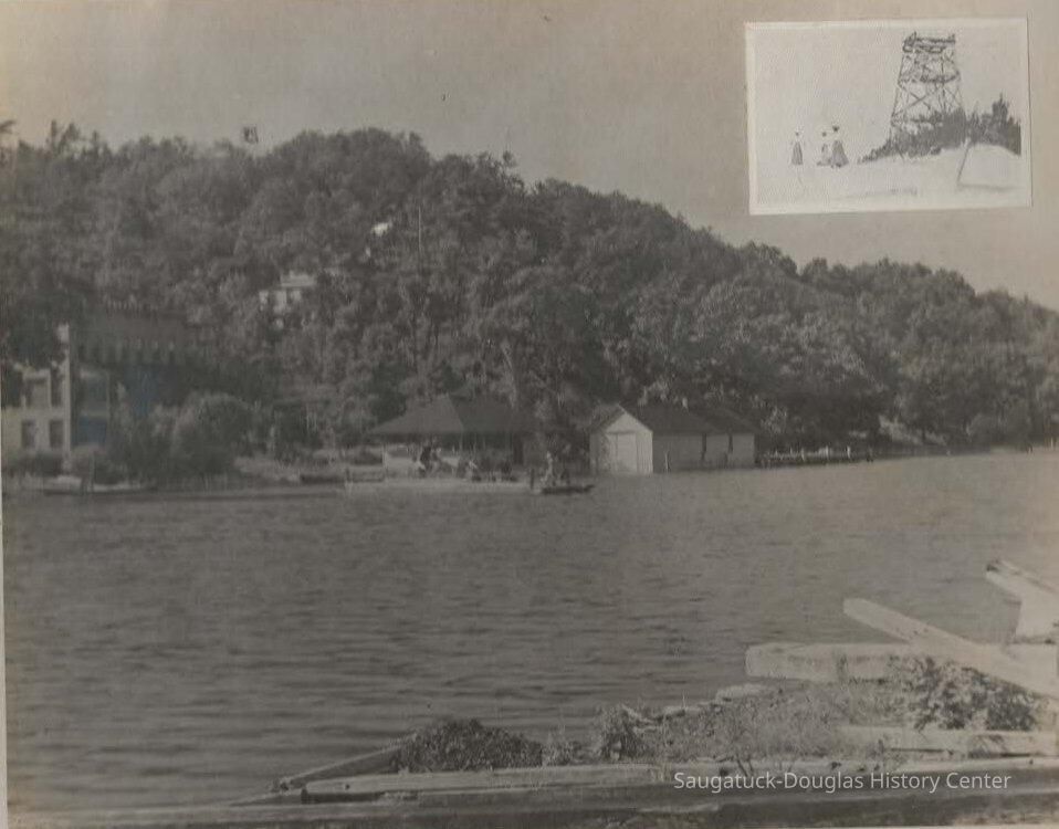 10"x7.5" black and white photograph of the Kalamazoo River looking across the river from Saugatuck Chain Ferry; Mt. Baldhead in the background. With an insert of the Observation Tower 1905Collection