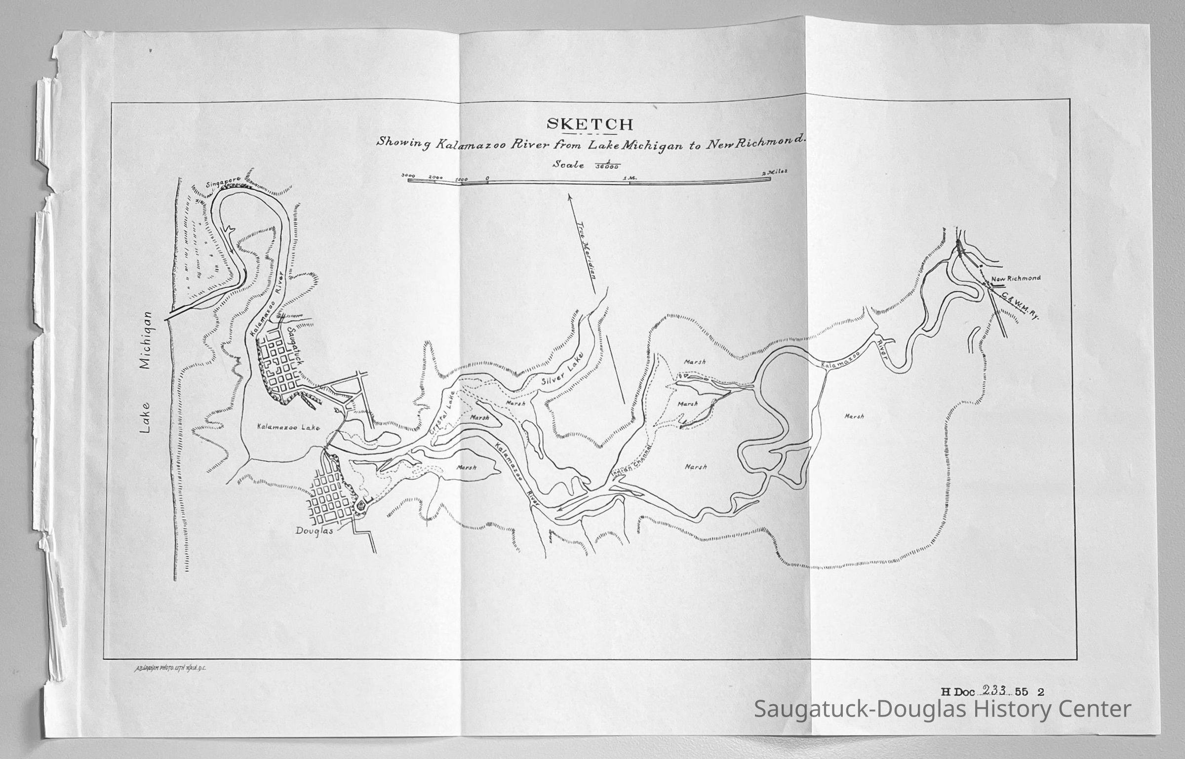 Landmarks visible but unlabeled include the H.B. Moore docks on the southeast edge of Douglas and the boom into Lake Kalamazoo from Saugatuck.Context