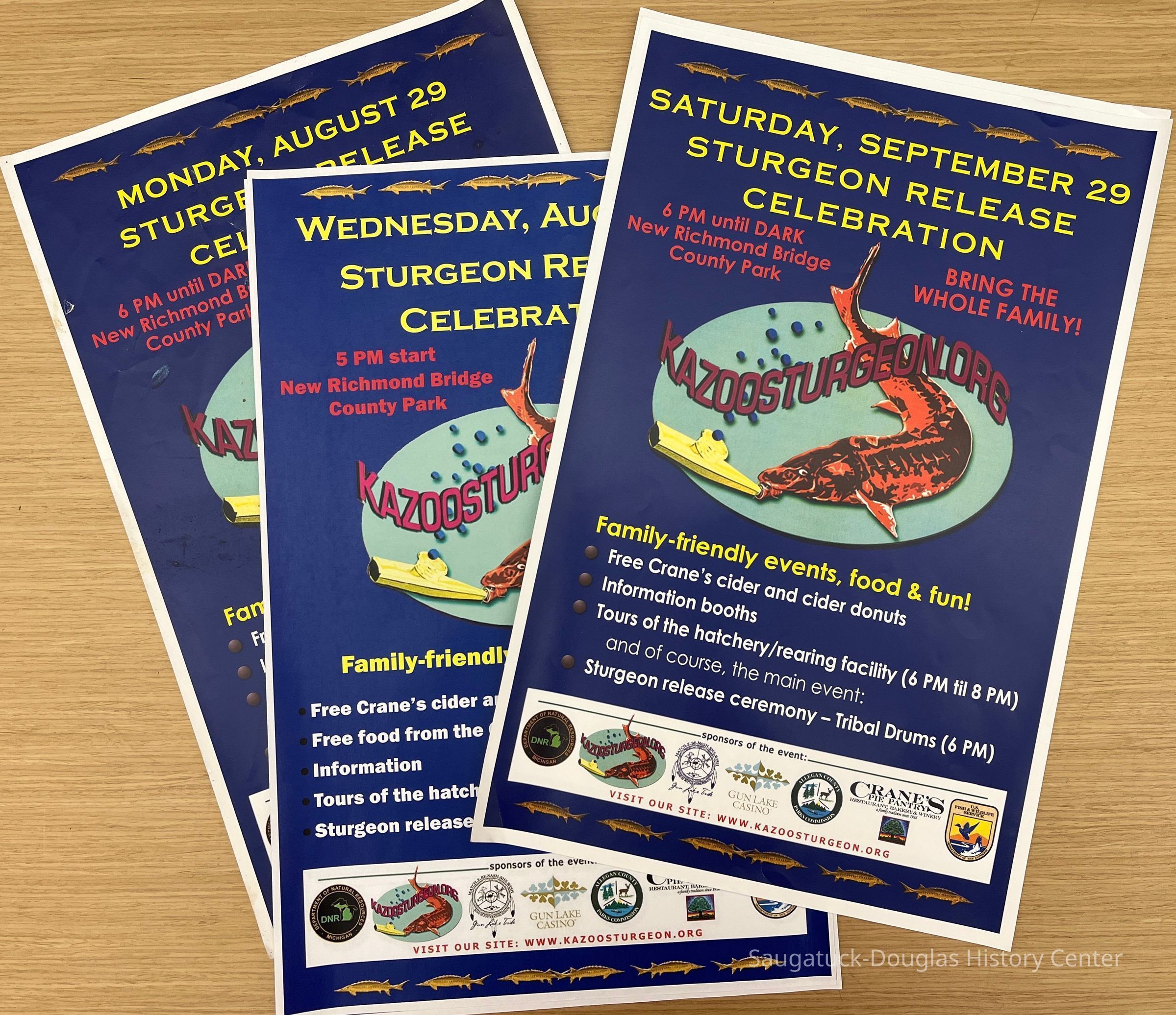 Kazoosturgeons.org promotional materials including posters and photos from the annual young sturgeon fish release celebration at the New Richmond Bridge.