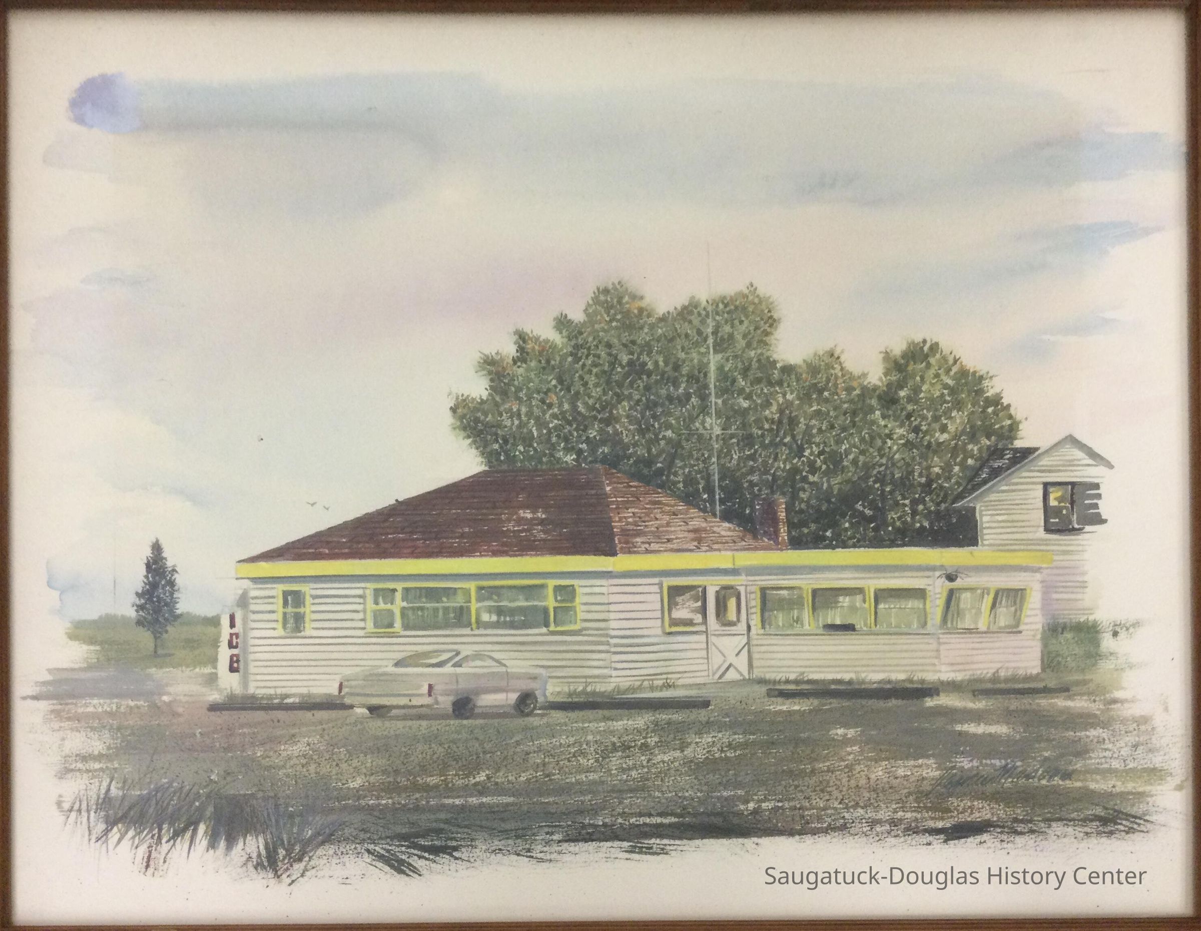 Watercolor painting of the Kalico Kitchen Restaurant in Douglas, MI c.1978 By James Madonia. Framed in a 3" natural wood frame. Non glare glass.Type of Painting