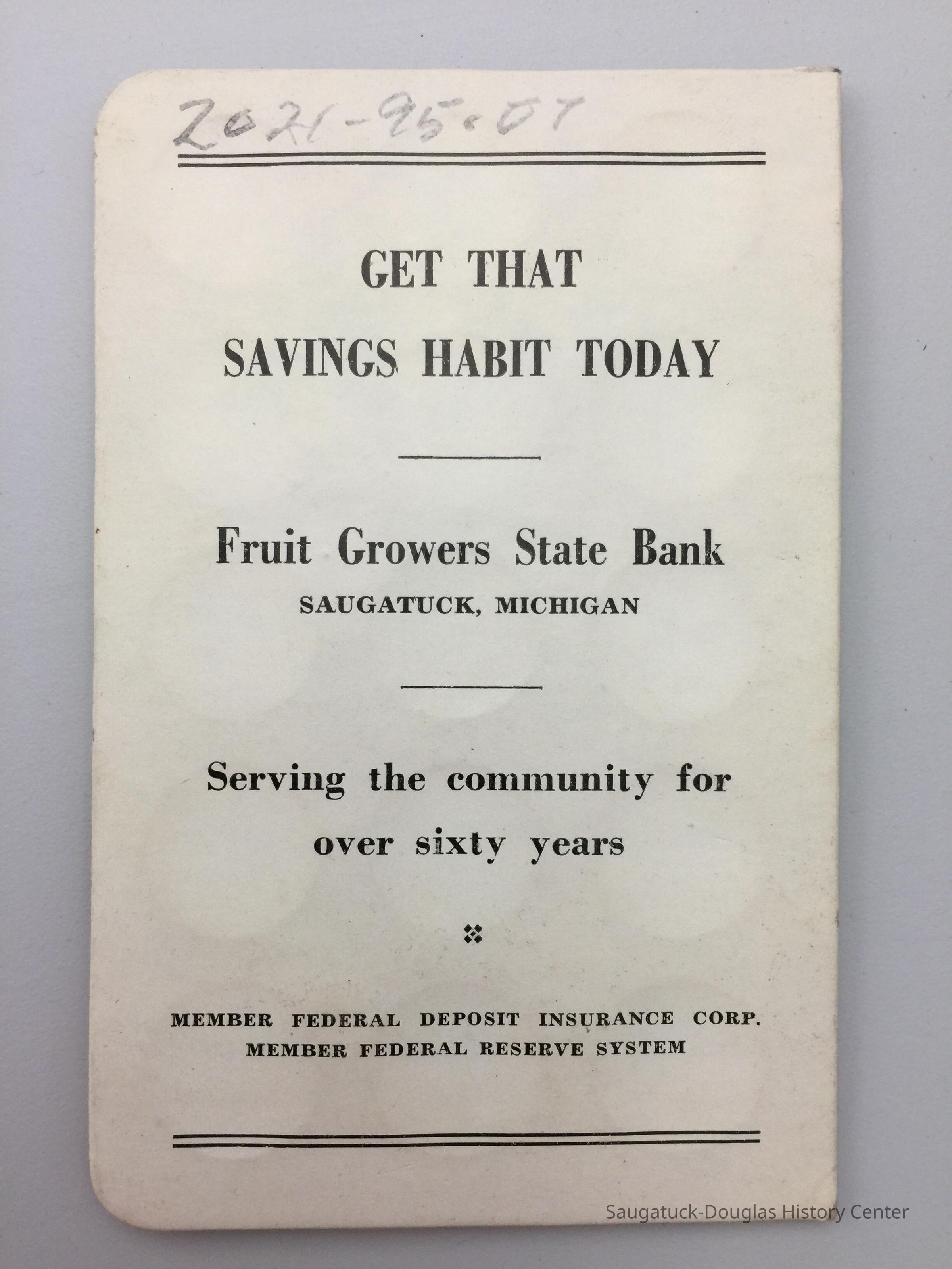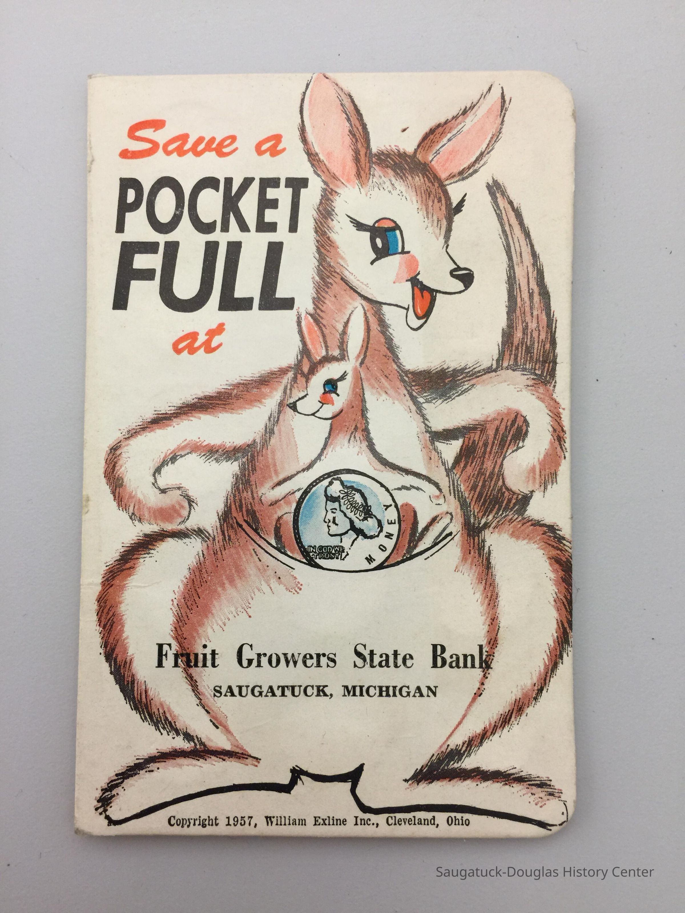 Coin-saver novelty with a kangaroo theme. "Save a pocket full at Fruit Growers State Bank" Copyright 1957, William Exline Inc., Cleveland, Ohio." is printed on the cover. Inside the booklet are paper pockets to slip coins.Cataloged By