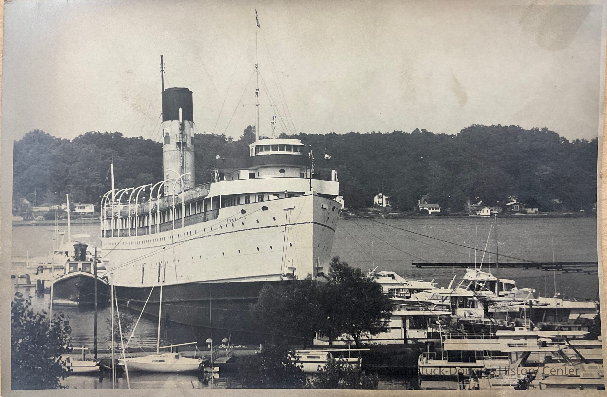 S.S. Keewatin moored at its first location at Tower Marina when it arrived in 1968. 5.5 x 7.75 inch black & white. On the reverse is “Tower” and “Keewatin”.