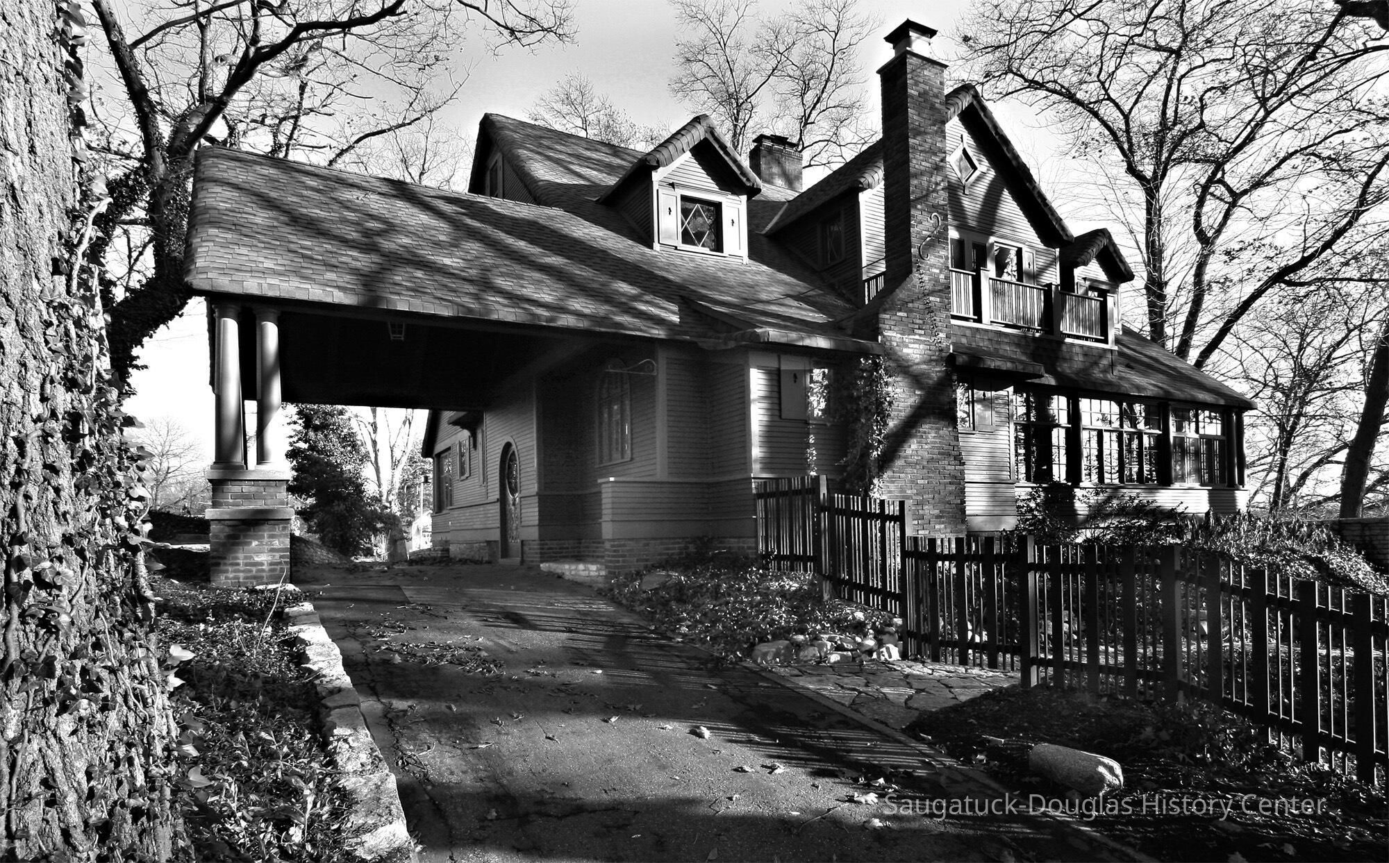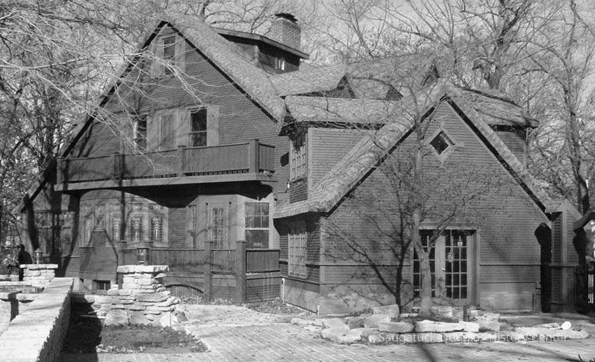 The end result was one of Michigan’s best designed and finely crafted houses of the period. Although Mrs. Springer’s correspondence suggests that they were good friends (even traveling companions), photographs from the period suggest a bit of artistic tension between Hoerman who was an Arts & Crafts guy and the very young Mrs. Springer who leaned more toward 1920s-30s Hollywood style (take a look at the photos in the current Saugatuck-Douglas Historical Museum exhibition). Hoerman drew upon Arts & Crafts, Prairie and Art Nouveau forms—with some references to the English Cotswold’s and his own Bavarian roots. The house features a grand porte-cochere, a colonnaded porch, a “false-thatched” roof, several very interesting fireplaces, fine Prairie-style stained glass windows, hand-carved doors, tile floors, and a German rathskeller. To top it off, a cavern (“rockery”) was carved into the hillside and made into a sitting room of stalactites, mushroom rock shaped tables, rock formations to show erosive action, a waterfall—and copies of Indian pictographs drawn on the walls, patterned after Indian dance rituals!