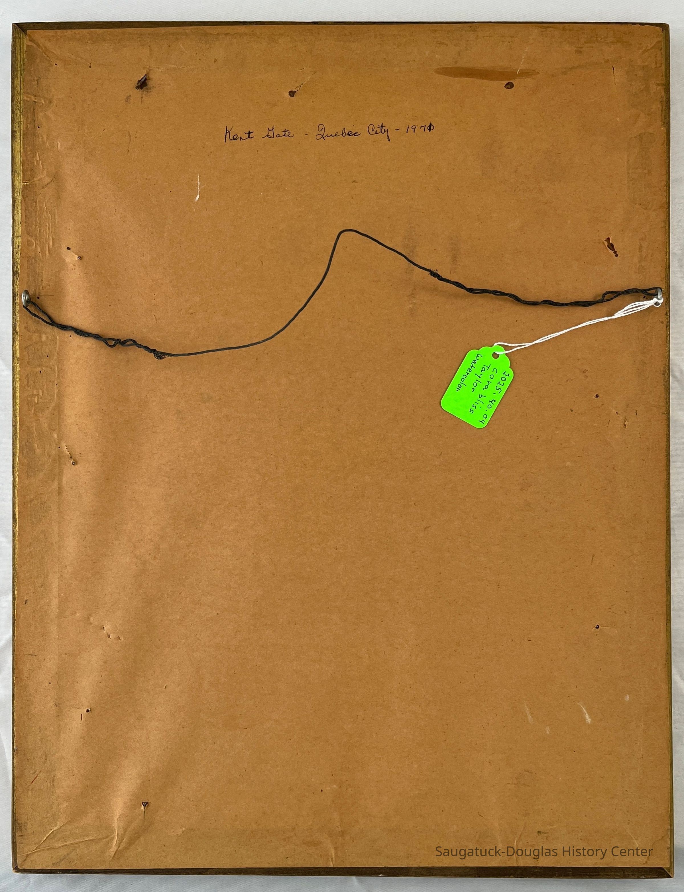 Watercolor painting of people strolling along a cobbled lane toward a stone, turreted gate with green roofs. Handwritten note on the back identifies the scene as "Kent Gate - Quebec City - 1971" [or 1970]