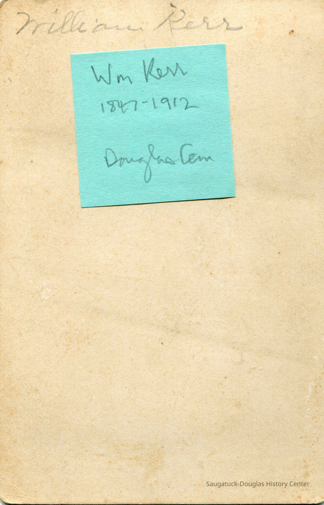 William Kerr is written in pencil on the back along with a green post-it noting the following in cursive: 1847-1912 Douglas CemeteryPhotograph Details