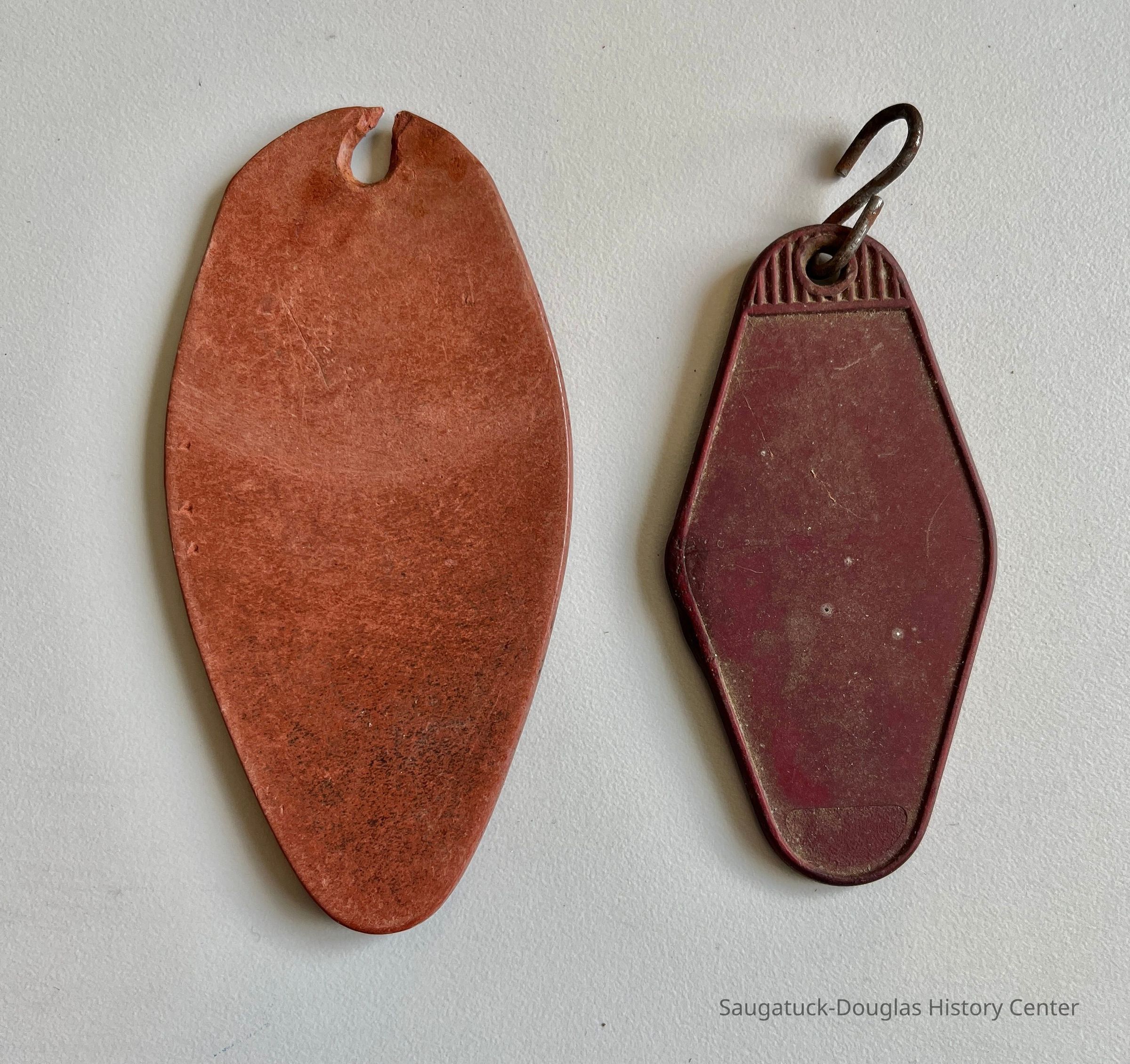2. Red-brown plastic fob from the Harding Hotel. The lozenge-shaped was molded with a raised border on the edge and ribs in the upper section where a rusty metal S-hook is still threaded through the hole. The keys are presumed to be from the first Harding Hotel.Collection