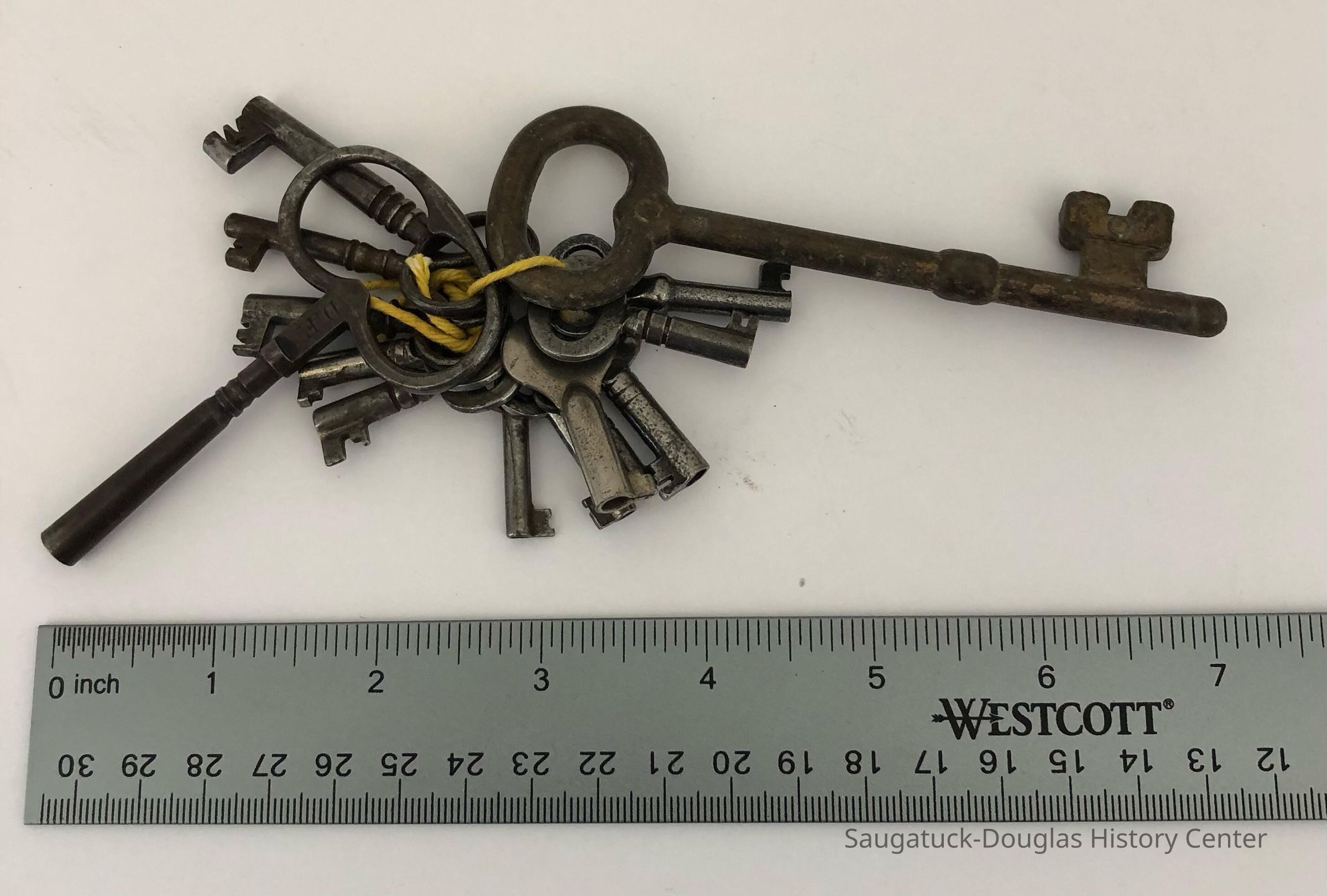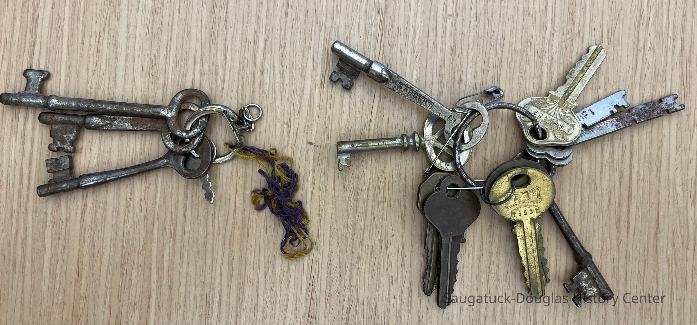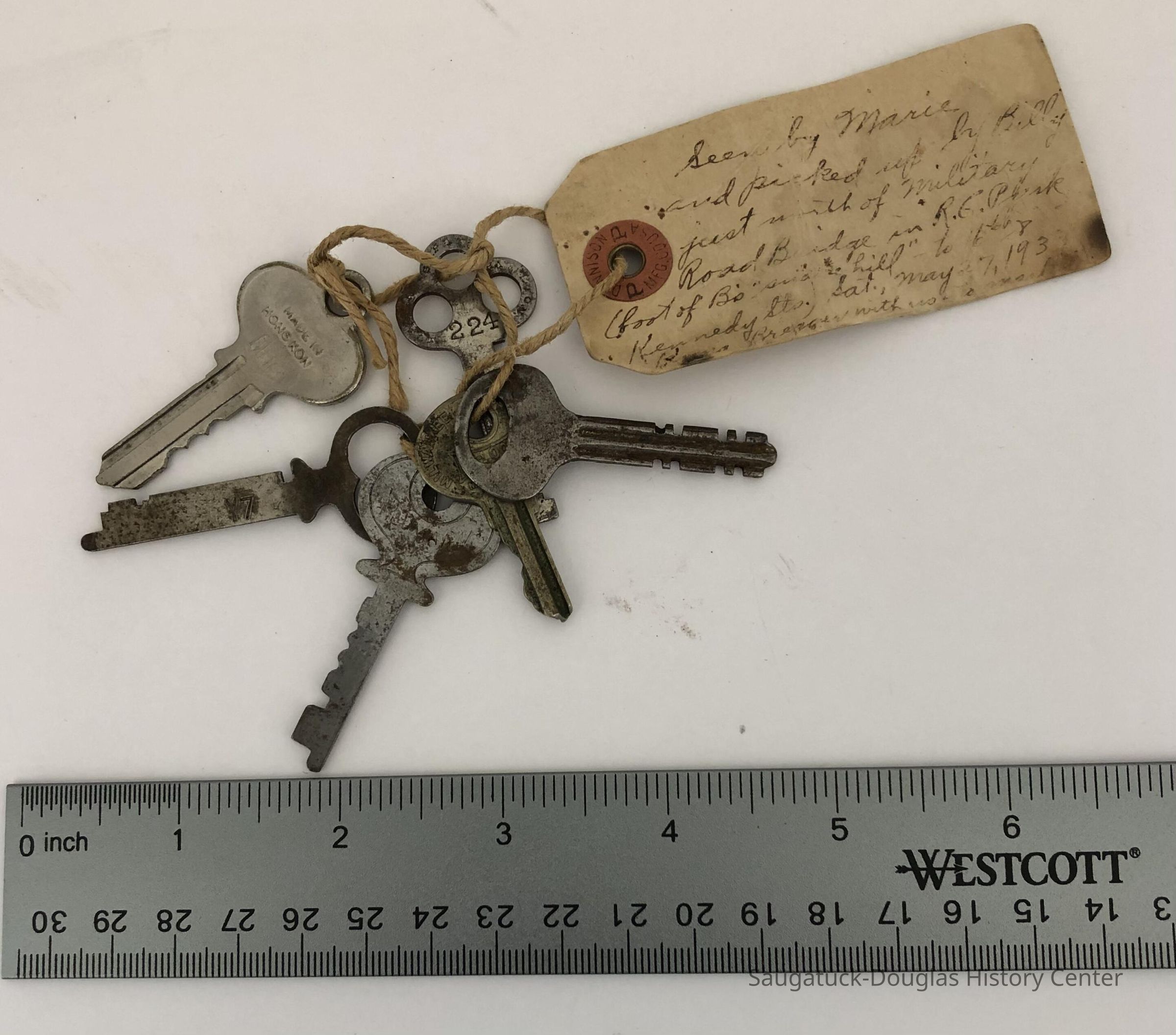 Four bundles of keys. One with an old tag and the others unmarked.Location