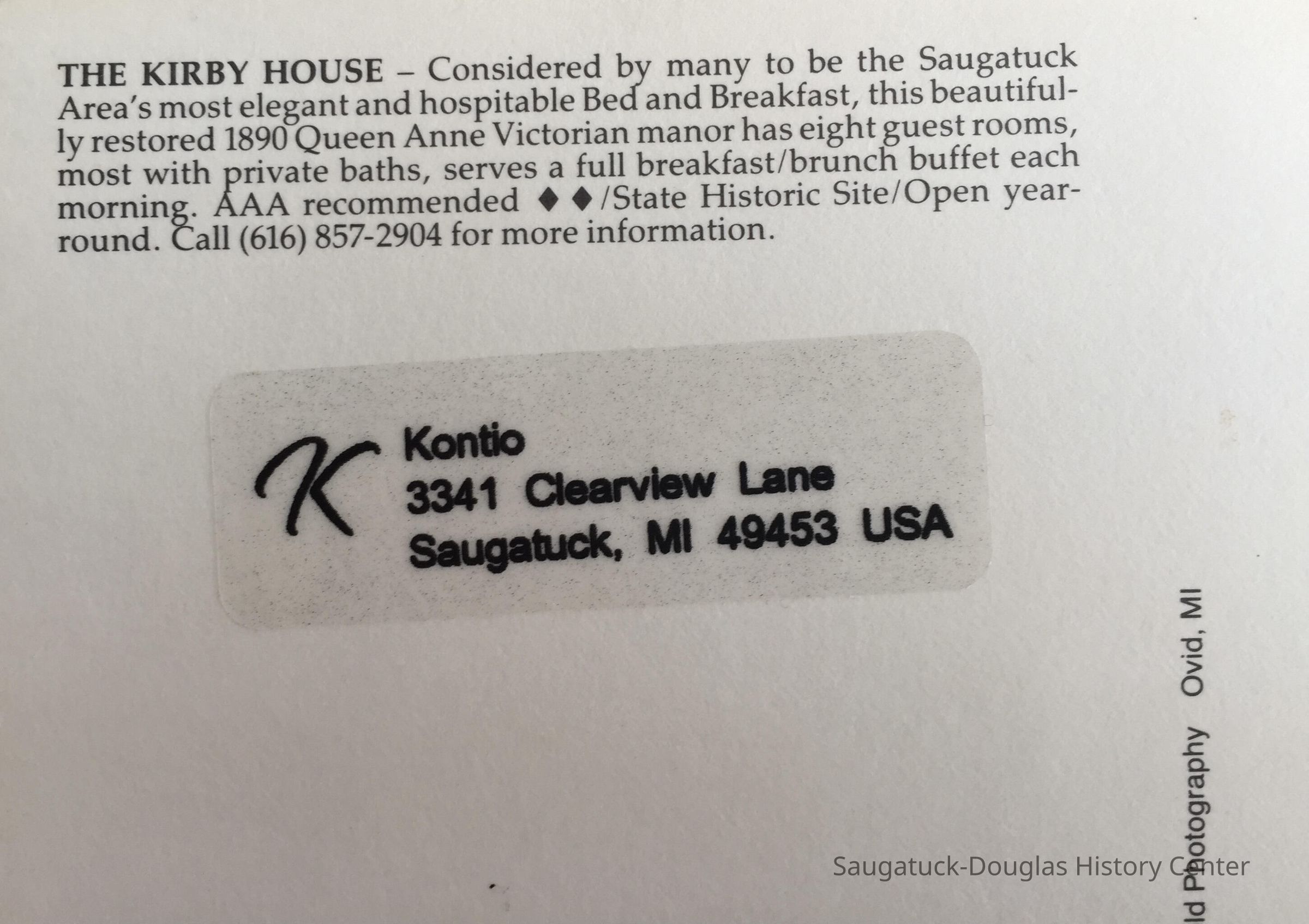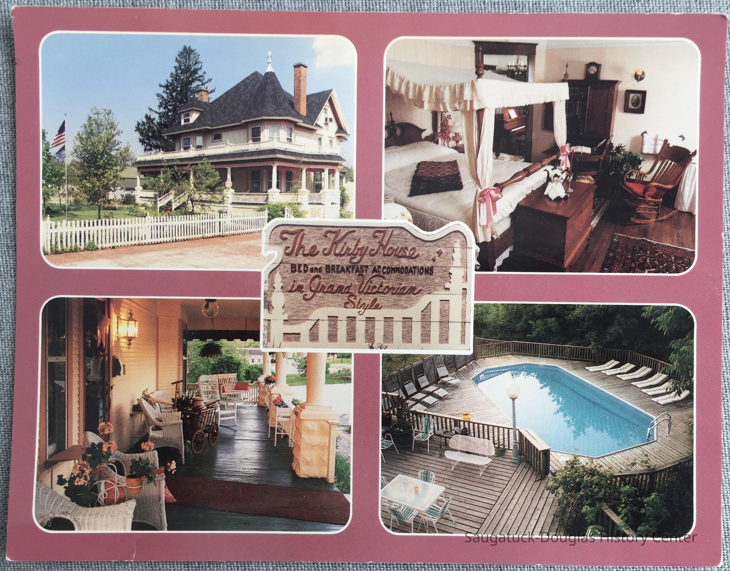 Unmailed postcard with views of the Kirby House building, a bedroom, the seating on the front porch, the pool and the sign.