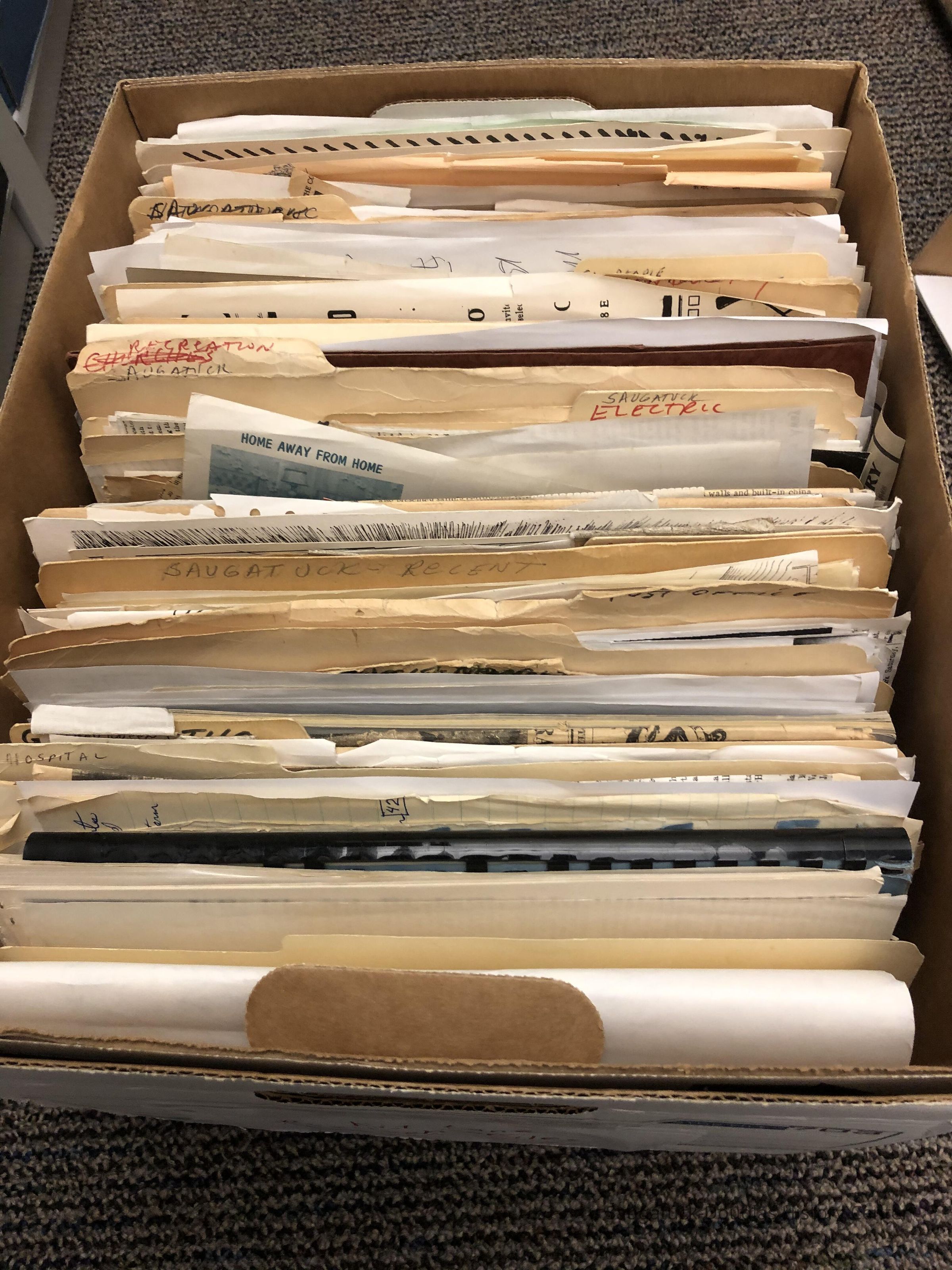 Includes folders with Kit's notes about Churches, Clubs, People/Homes/Condos, Industry/Mills, Recreation/Golf/Parks/Big Pool/Pavilions, Electric System, Resort Advertising, Resorts, Post Office, Isle of Mann, Community Hospital, Library, Lake Michigan/Oval, Harbor, Boats/Ships, Camp Oak Openings, May Francis Heath, Fur Traders, Forward Movement/Camp Gray, Ferry, Saugatuck Township, Origin of name Saugatuck, Iris Flower, Music, Maps, May Family, Ox-Bow, Liquor, Development, Christmas Ornament, Saugatuck History, Photos, Miscellaneous, Saugatuck History Museum, Airport, Art/artists/organizing the "Painting the Town" exhibit