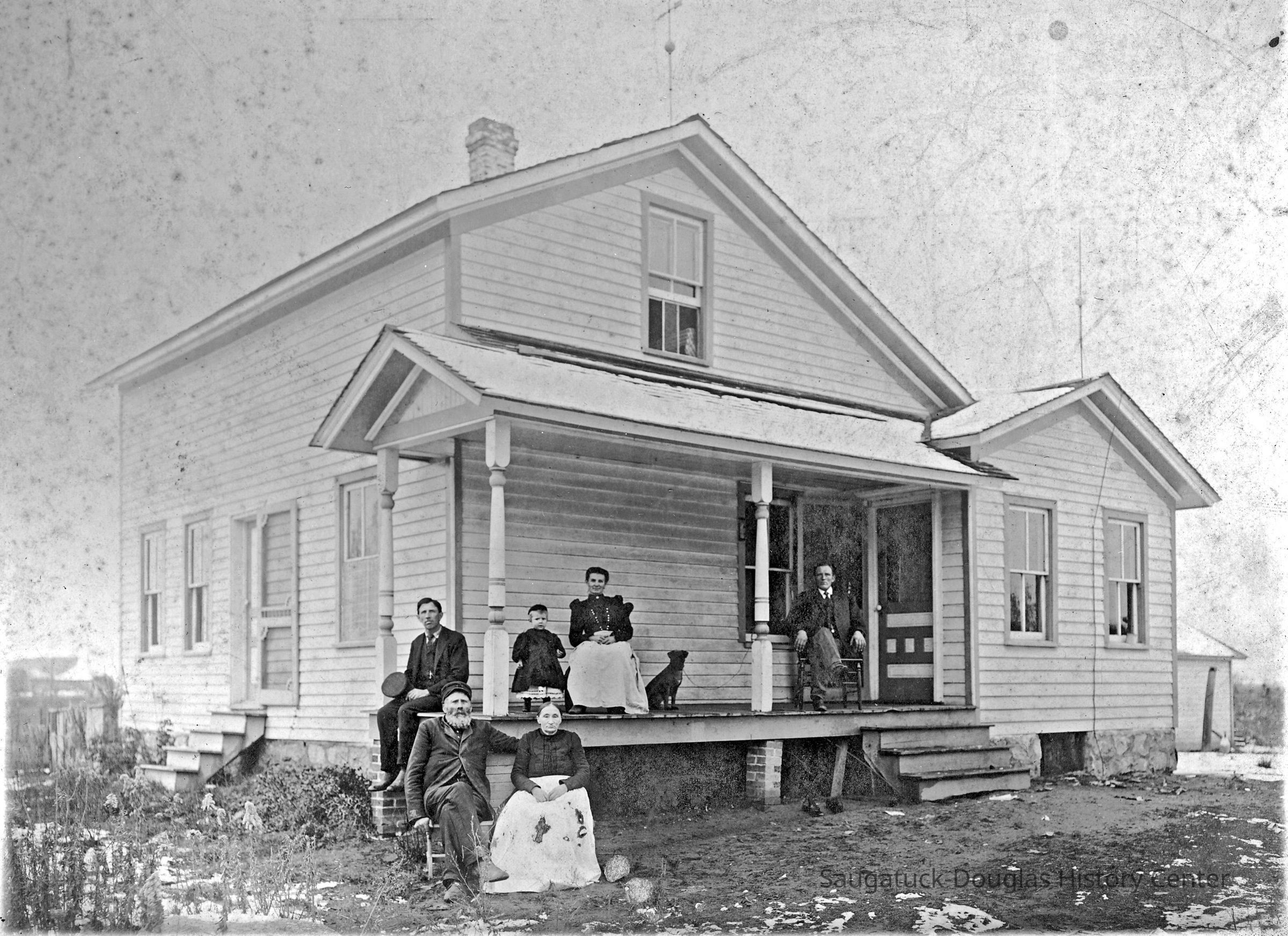 Photo of Kleinheksel family sitting on the porch of their farmhouse, ca. 1910 with caption on back "Mr & Mrs H.H. Kleinheksel - son Gerrit."