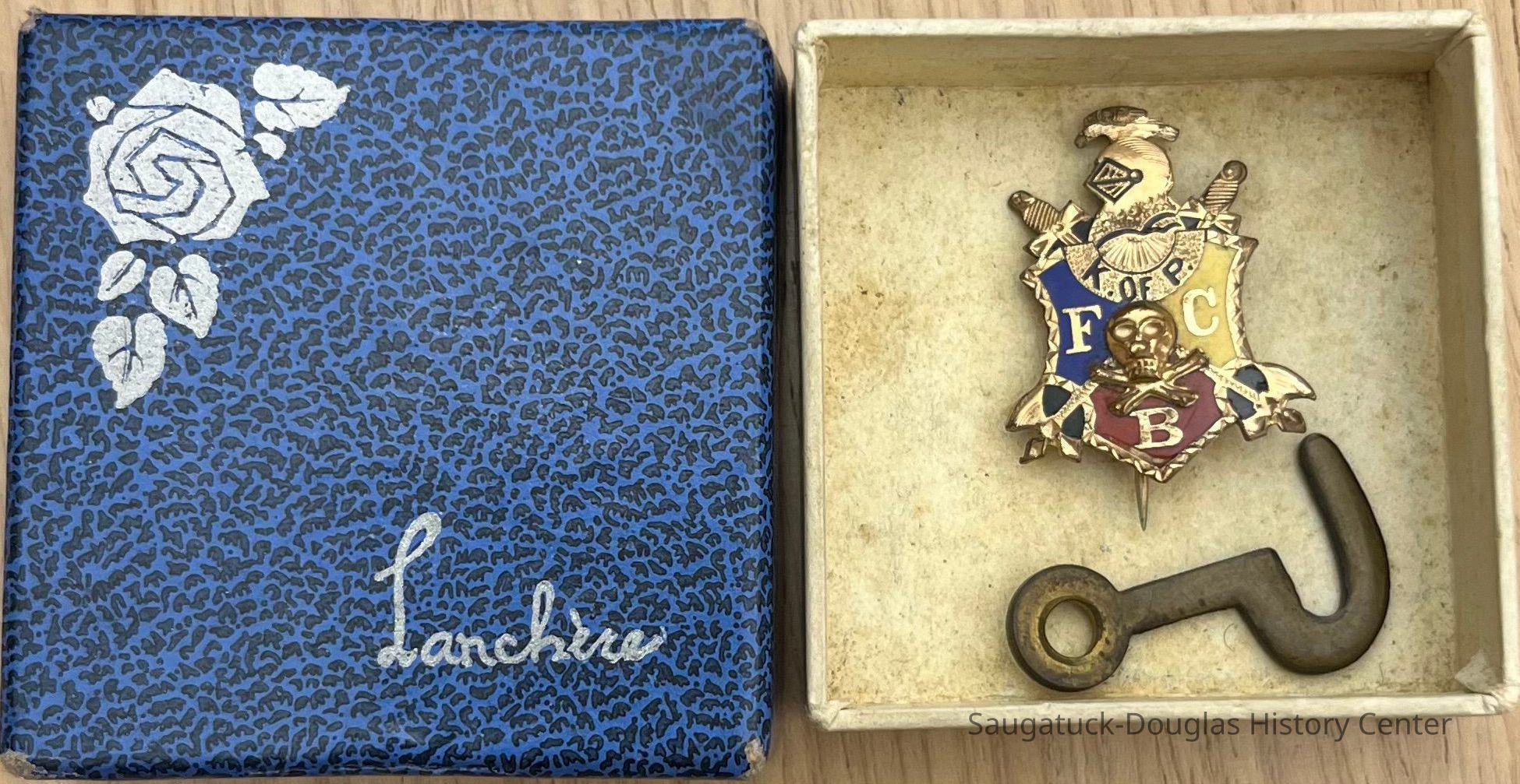 Pin is a 1.5” x 1.5” x .5” blue, paperboard box along with a metal latch.Context