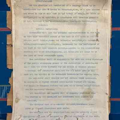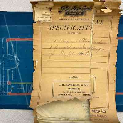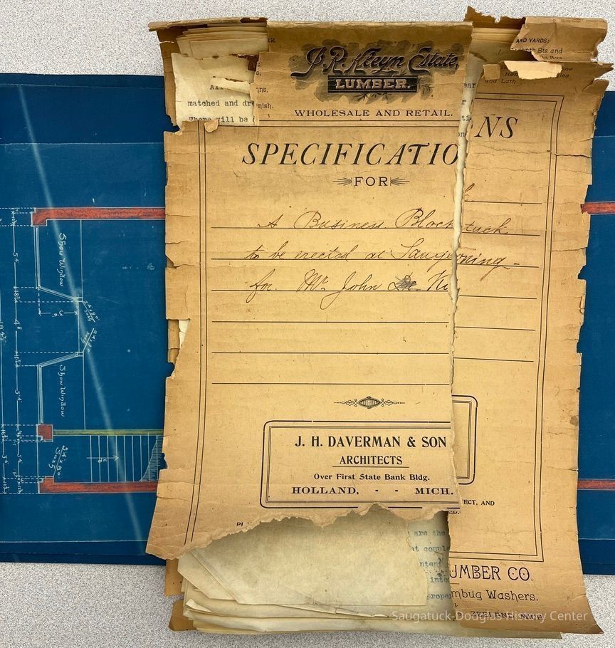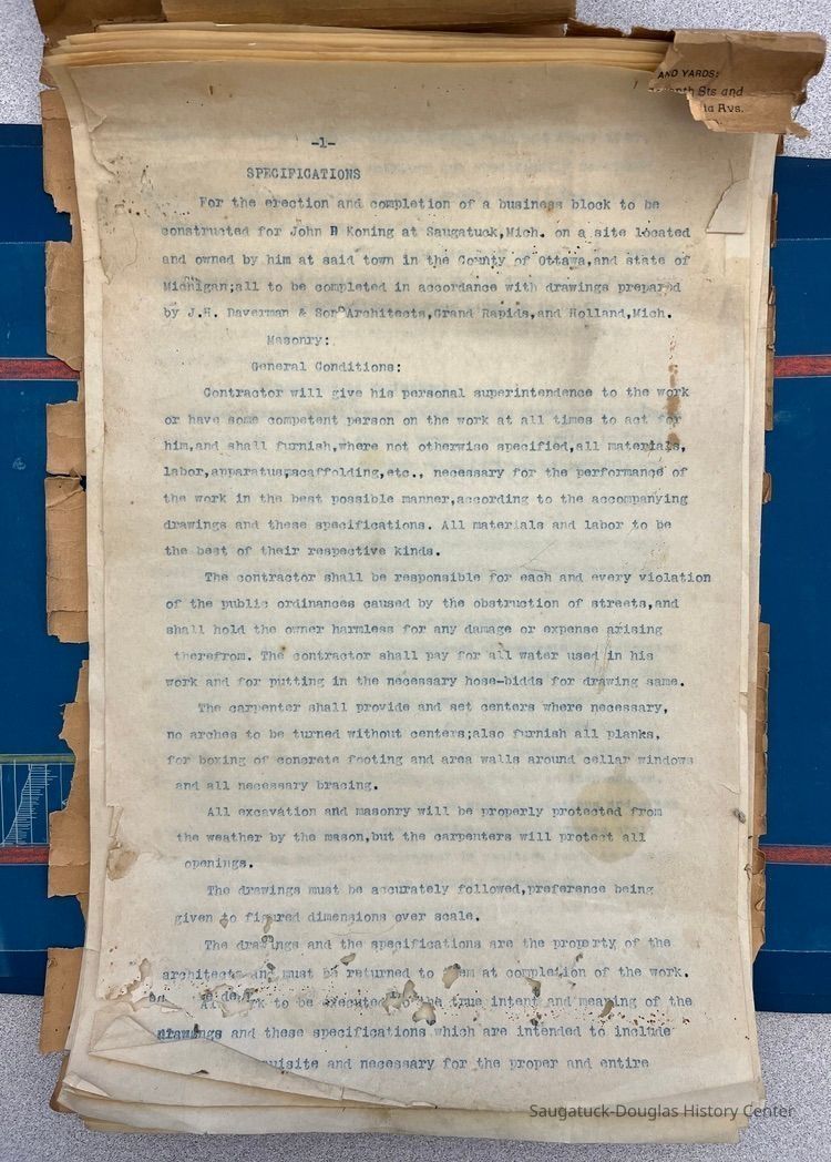 14x10" booklet of architectural specifications for "A business block to be erected at Saugatuck for Mr. John Koning" produced by "J.H. Daverman & Son, Architects, Over First State Bank Bldg., Holland, Mich."; six pages of 11x30" blueprints for the building rolled in a 13x3" cardboard tube.Context