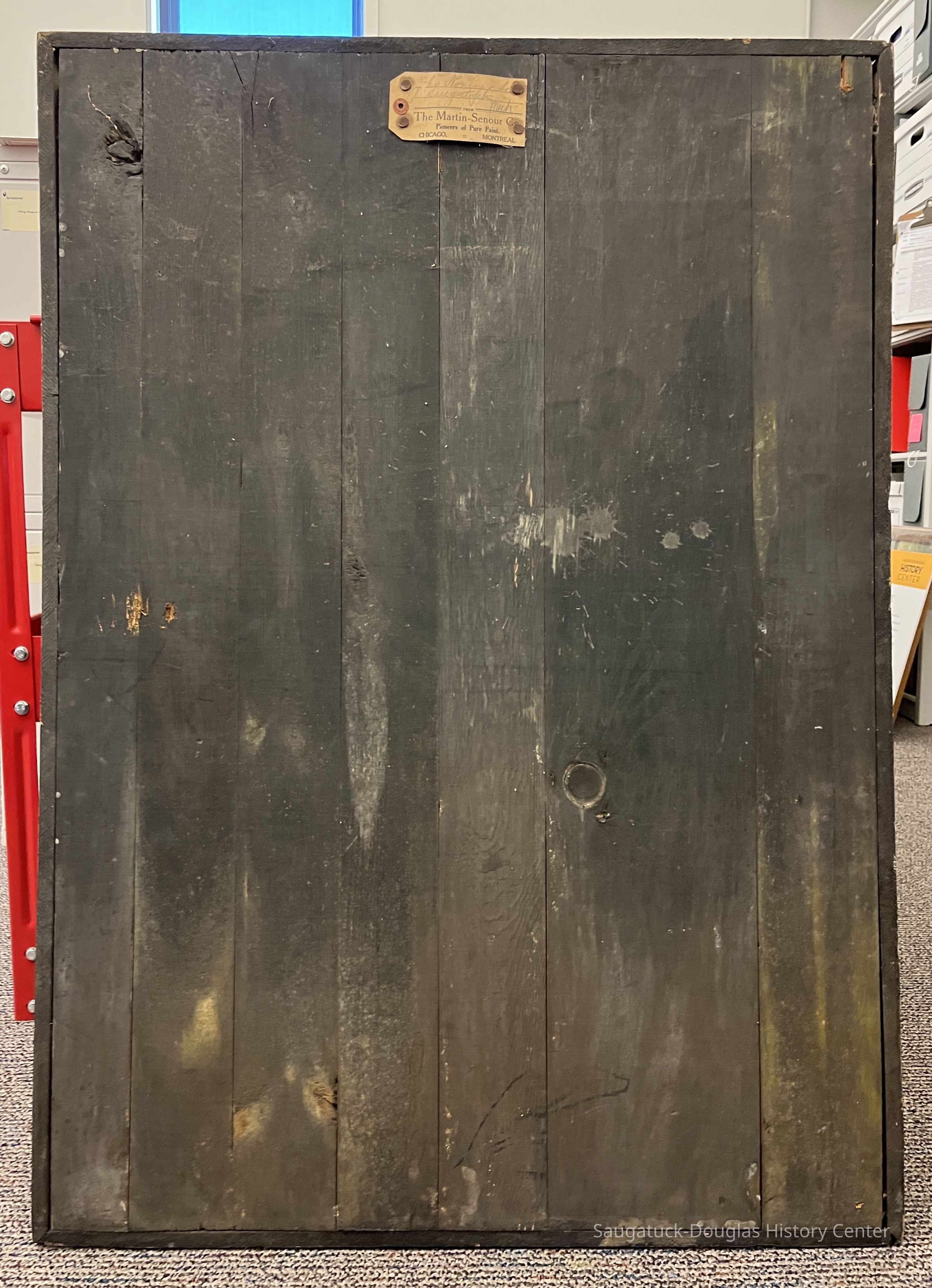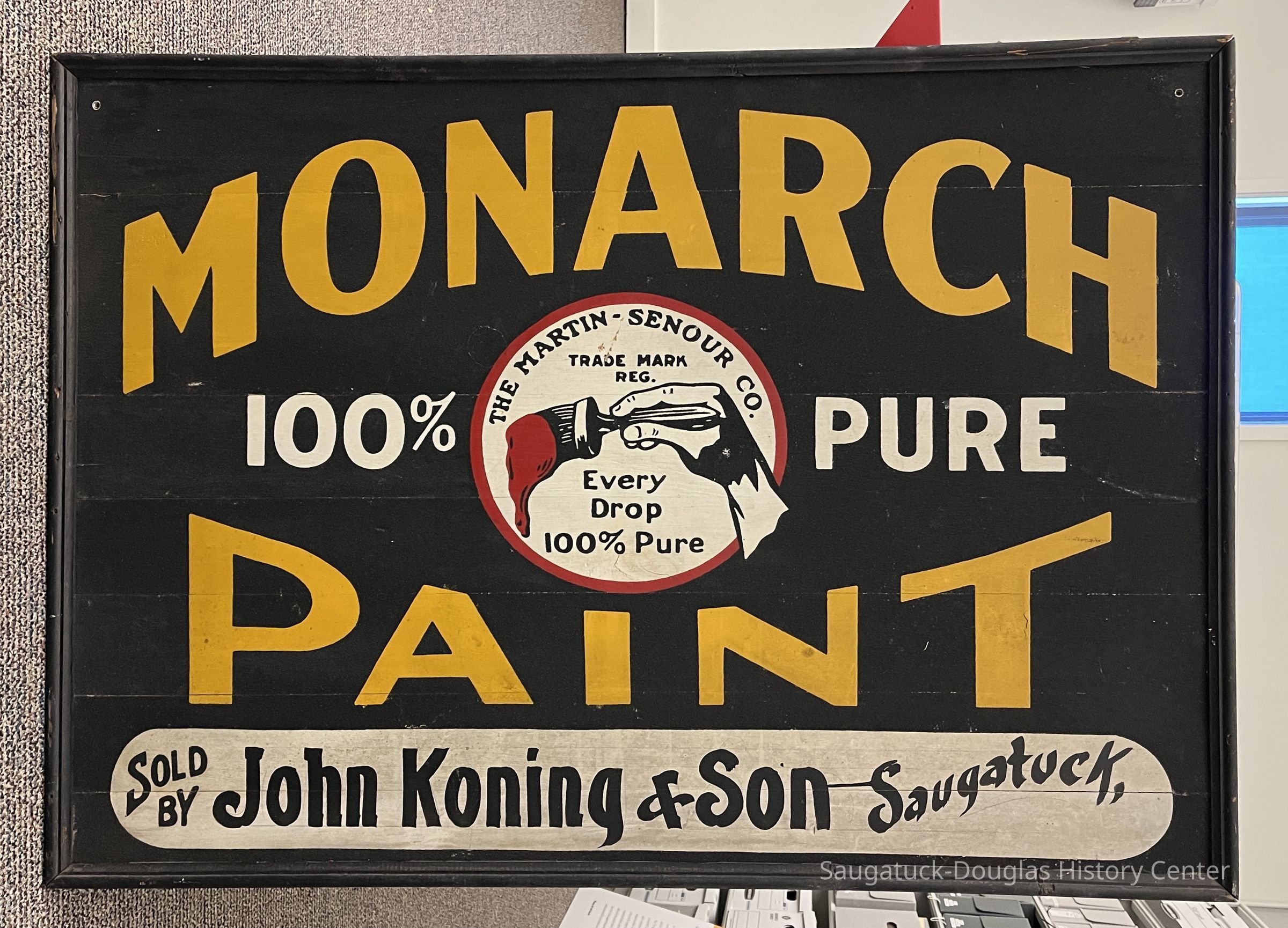 Wooden plank sign with edging board. The front of the sign is painted black with the text "Monarch Paint" in yellow letters, "100% pure" in white letters. A central, circular logo depicts a hand and a paint brush dripping with red paint and includes the text "The Martin-Senour Co. Trade Mark Reg. Every Drop 100% Pure". The bottom of the sign has a "sold by" white oval that was used to customized the sign for the local paint dealer.Context