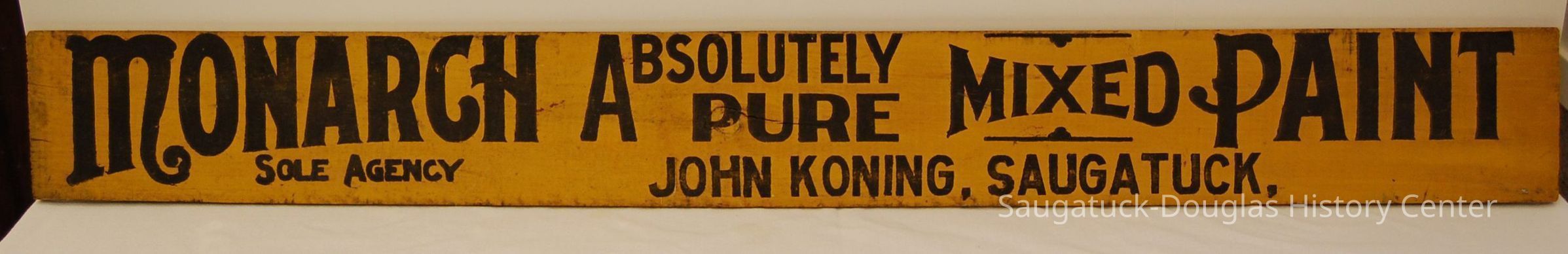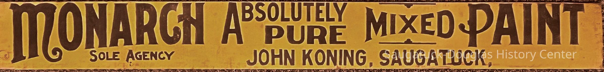 Narrow, painted, solid-wood sign that reads "Monarch Absolutely Pure Mixed Paint, Sole Agency John Koning, Saugatuck"