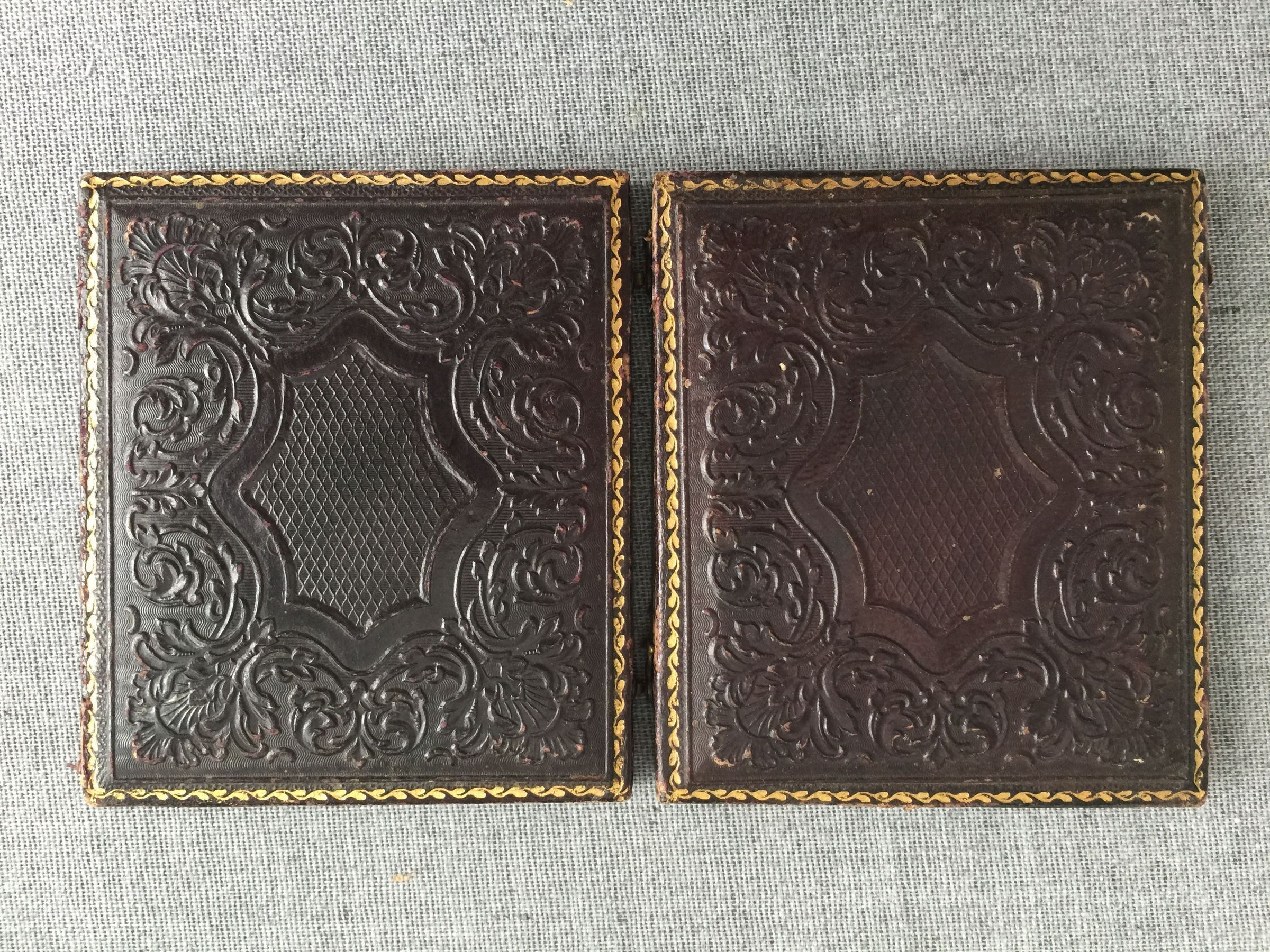 The sitters are two men but they are not identified. Pink color has been added to enhance their cheeks. The frames are highly ornate with embossing on the leather-like covers and much gold decorations on the interior mats. The spine is torn so the photos are completely separate. The photos have different-shaped mats so although the covers and latches match, they may not be a pair. Each framed images is about 3 x3.5 inches.Photograph Details