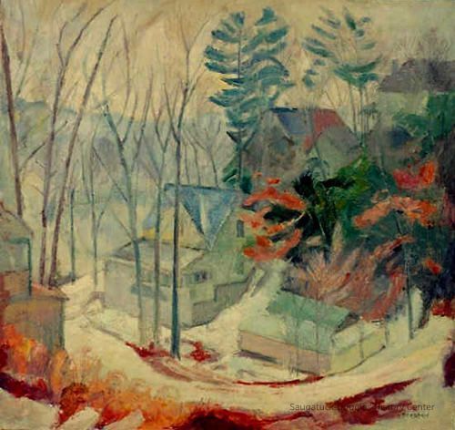 The SDHC's collection includes a Krehbiel painting of the Carl Bird boat shop that is a example of Krehbiel's Saugatuck snow and winter scenes.