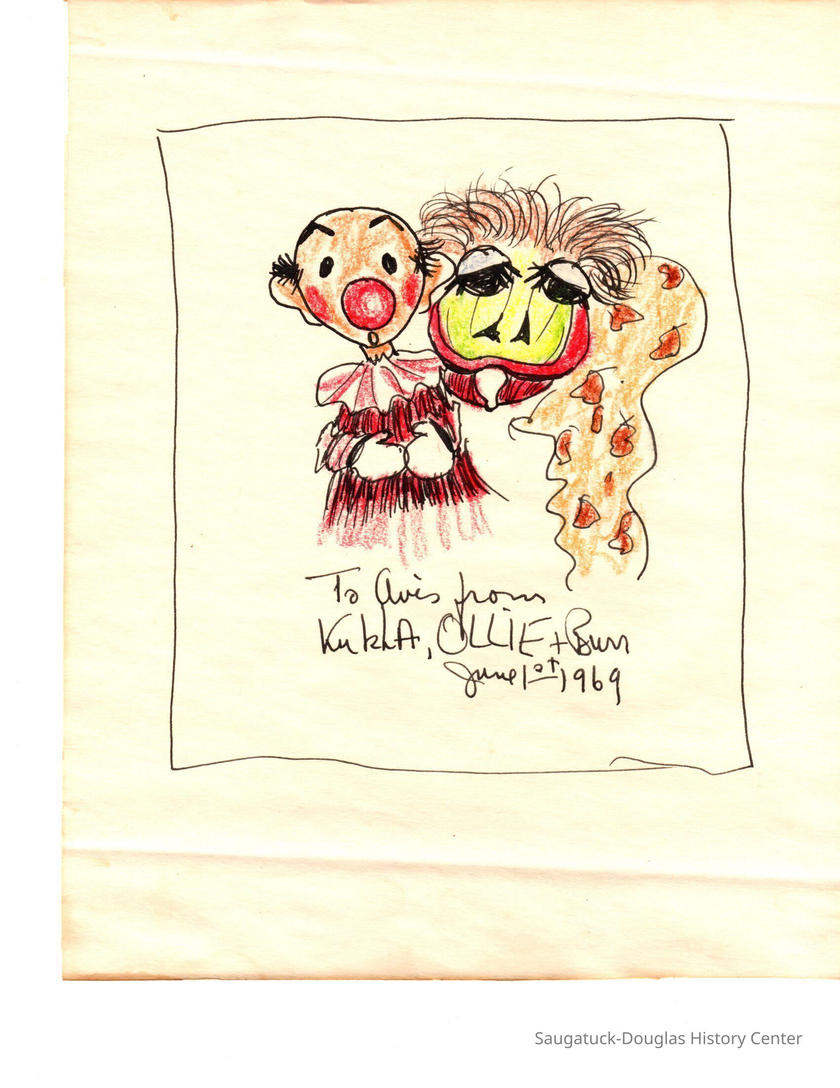Framed drawing of Kukla and Ollie by Burr Tillstrom with the inscription: To Avis from Kukla, Ollie and Burr, June 1st. 1969. Framedbehind glass in narrow black wood frameCollection