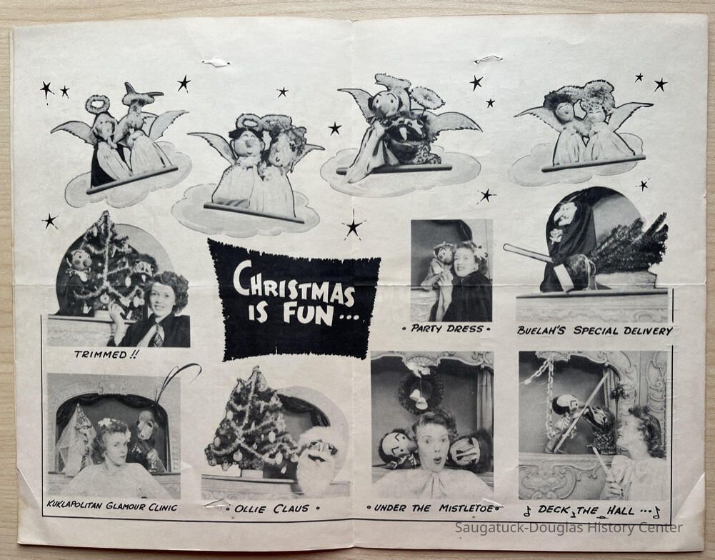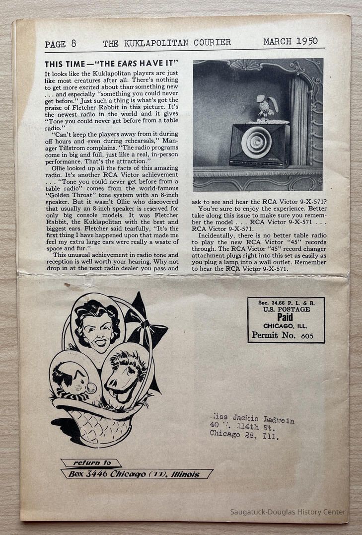 Donation also includes a picture postcard with a 1954 photo of Fran and the puppets taken from a dramatic side-angle.Context