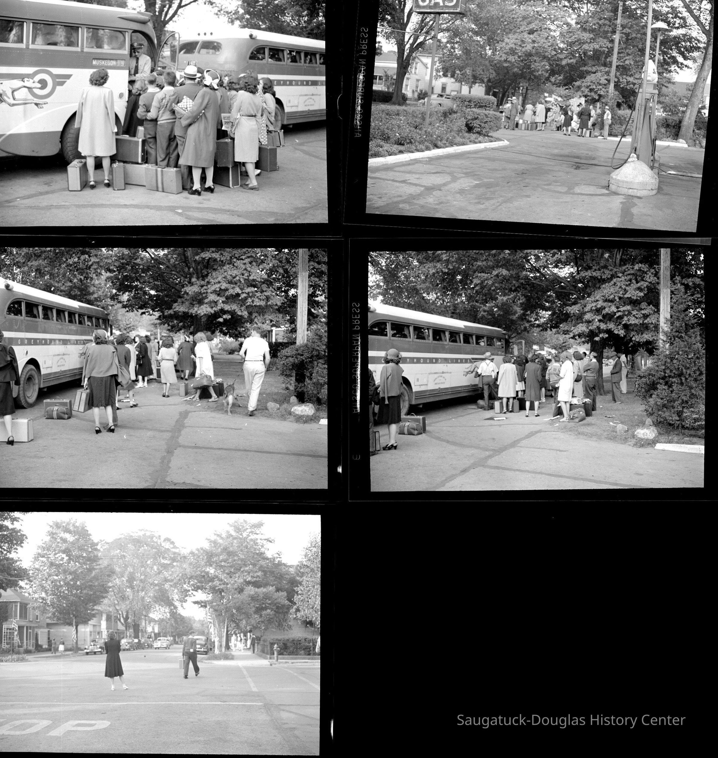 Greyhound buses loading passengers after Labor Day. Location is in front of Snug Harbor Gas Station at Culver x Butler