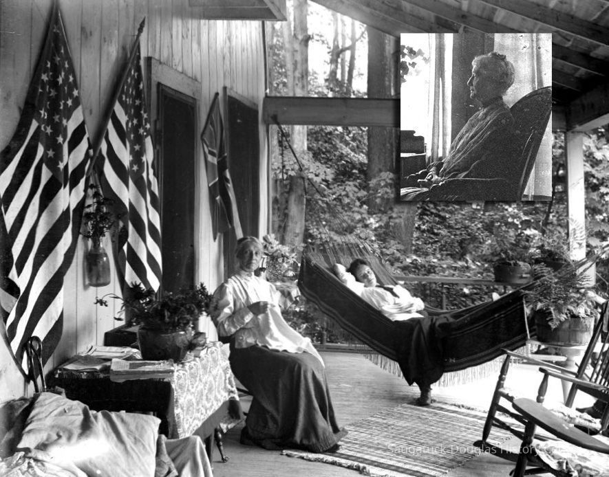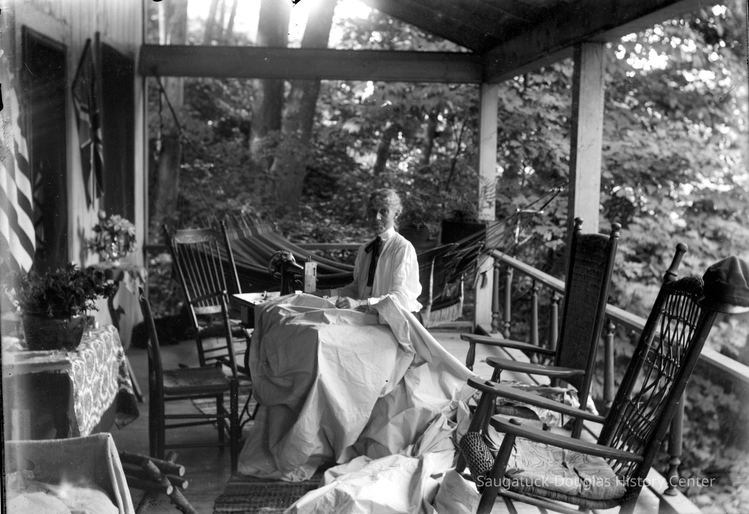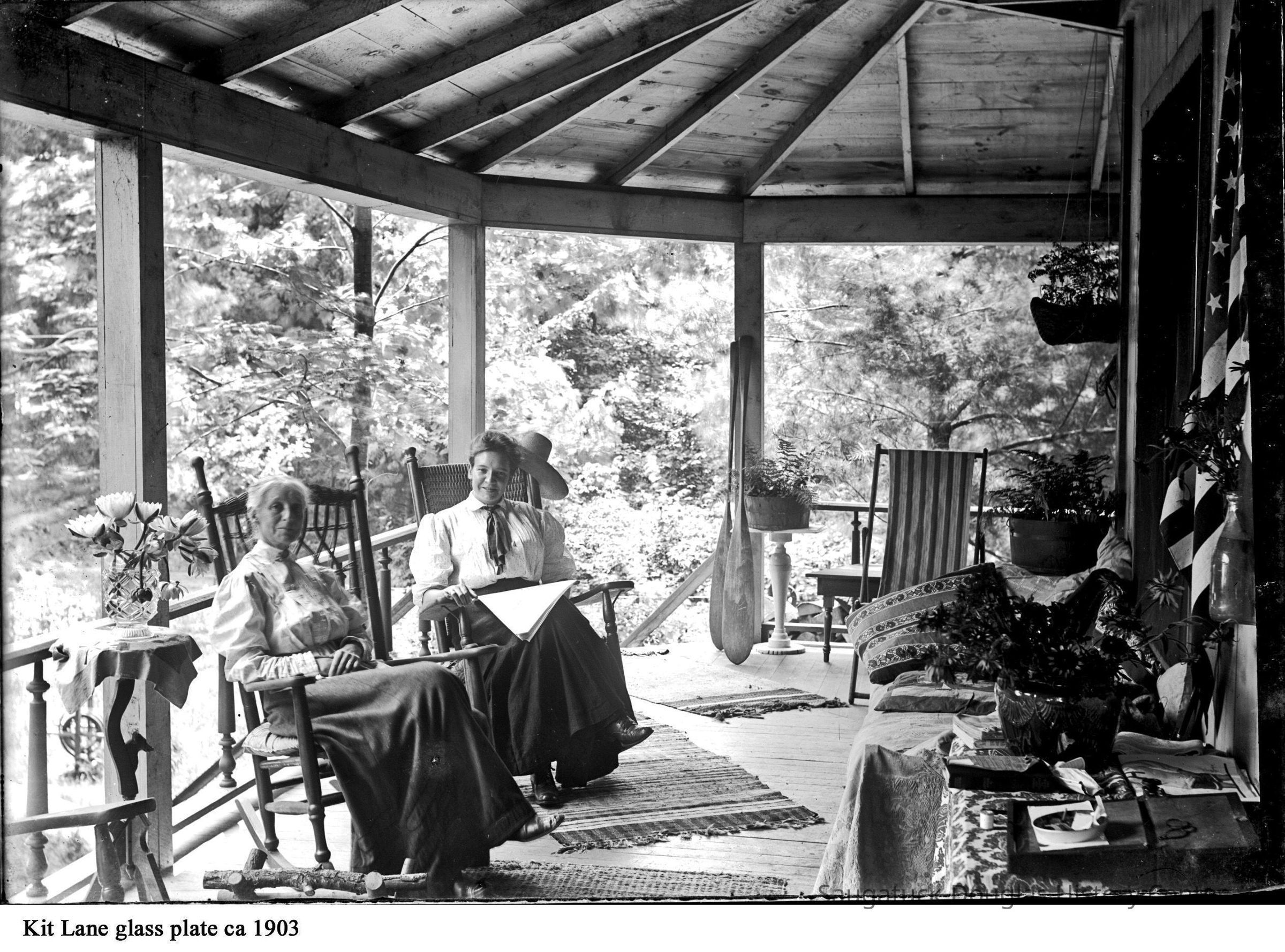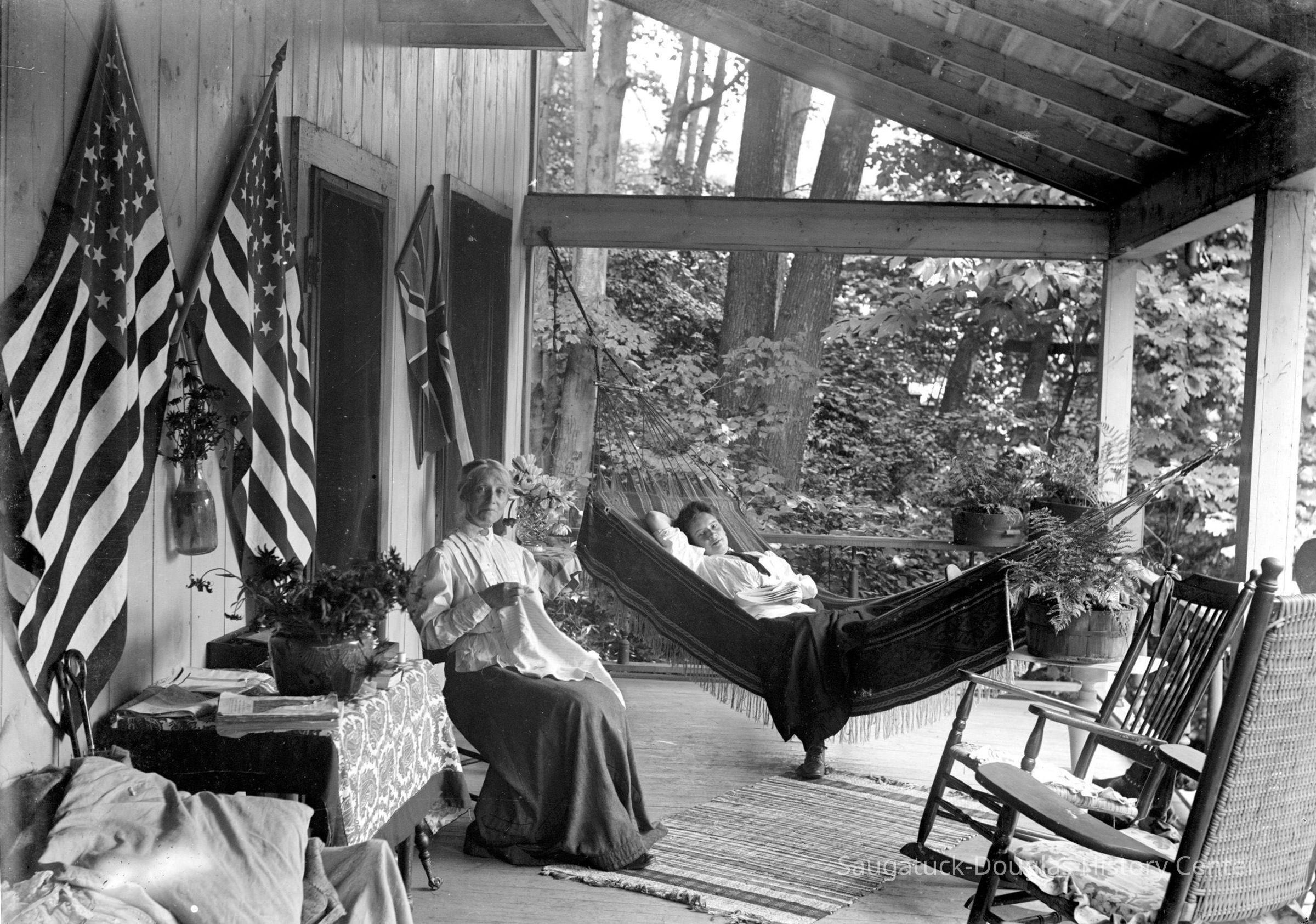 An older woman looks up from her hand sewing while a younger woman reclines in a hammock. The women are on a well appointed park with United States and British flags decorating the wall, rocking chairs, and potted plants. These images were taken from glass plates that belonged to Kit Lane.