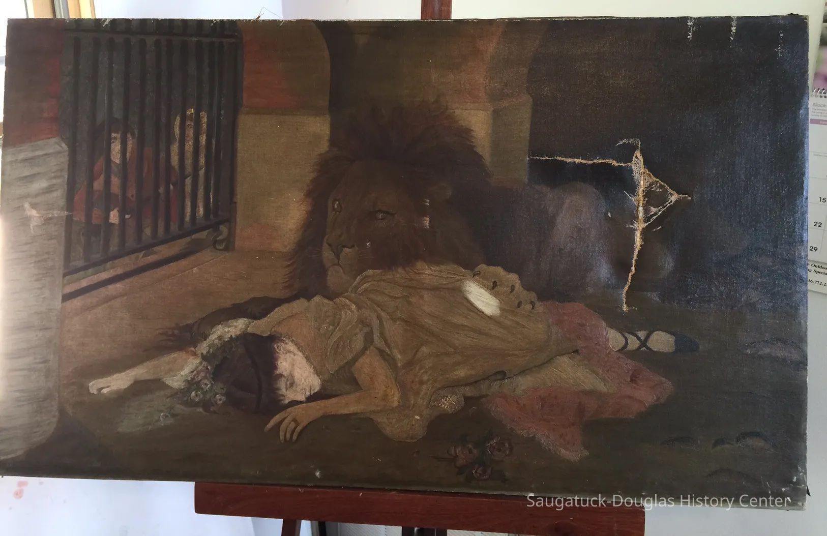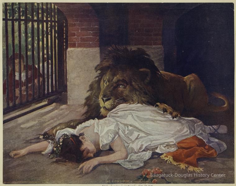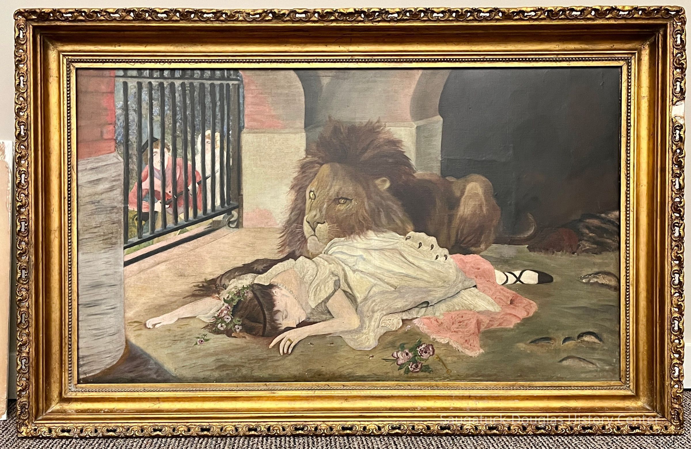 1.The version of the Grimm Brothers fairy tale linked to the blog entry contains no scenes like that it the painting. A print out of the linked tale is in the accession folder. Other titles for this tale are "The Singing, Springing Lark", "The Singing, Soaring Lark", "The Lady and the Lion" or "Lily and the Lion" (German: Das singende springende Löweneckerchen)