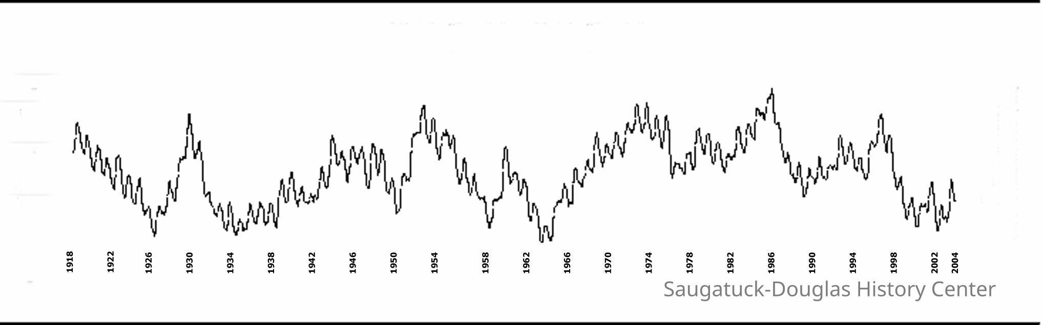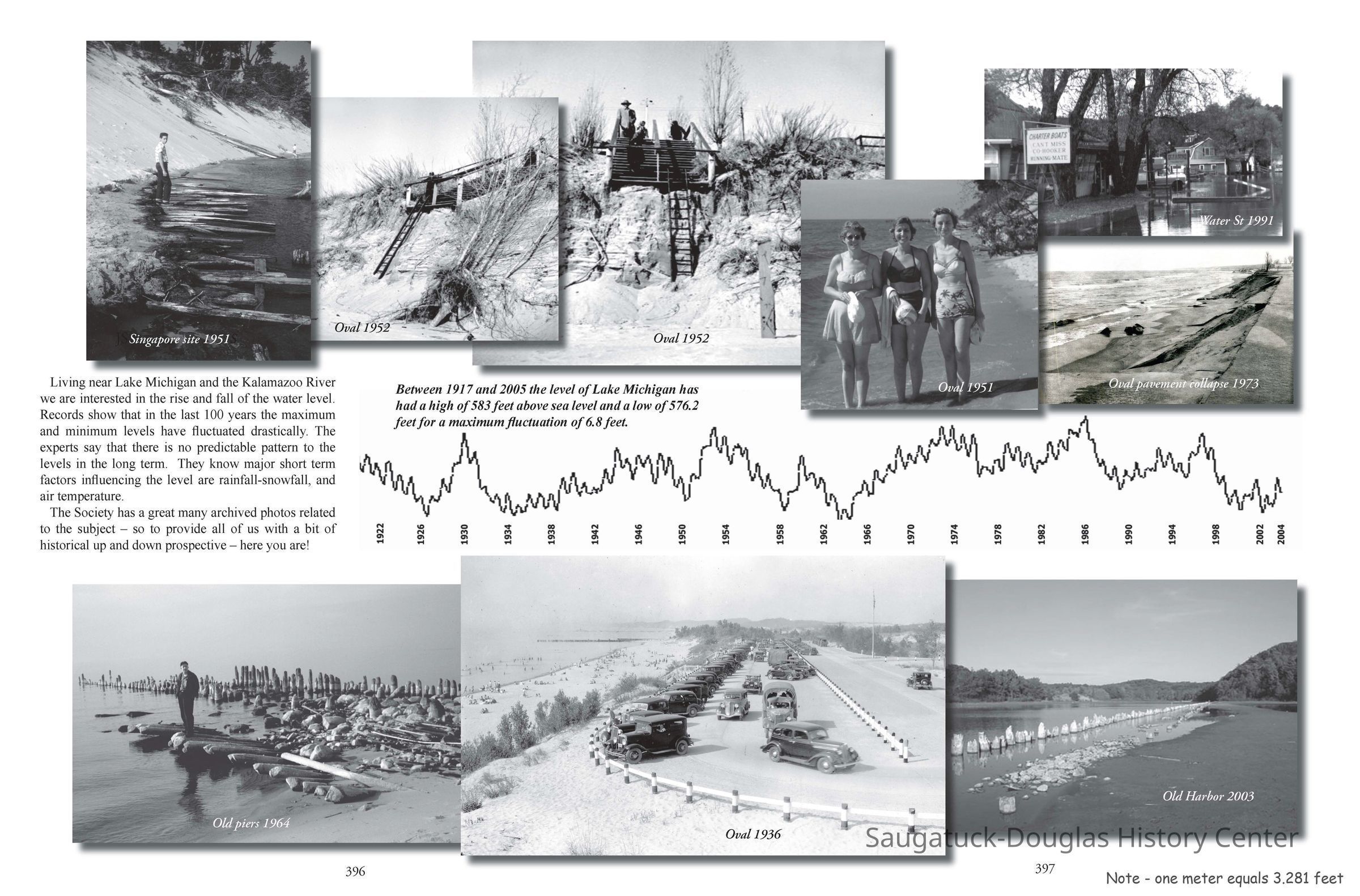 Graphic from a keynote presentation by Jack Sheridan about historic fluctuations in Lake Michigan water levels. The graphic was reprinted in the SDHS newsletter insert page 396. The graphic includes data from 1922 to 2004 plus eight photos of erosion/submerged details revealed or flooding between 1936 and 2003Context