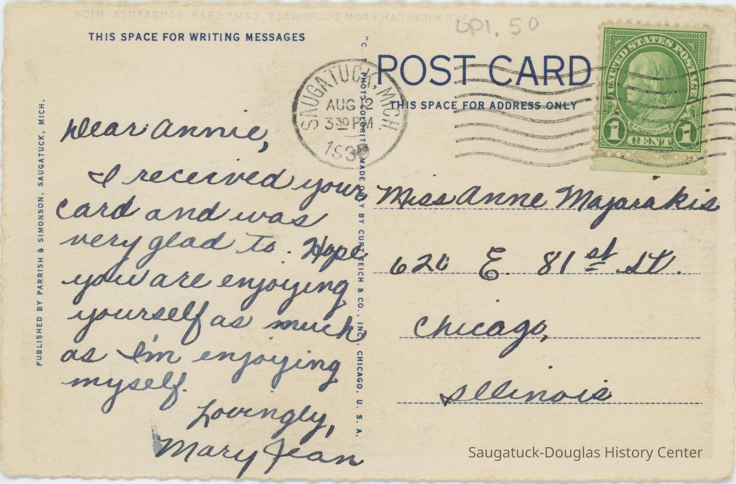 Postcard from Mary Jean to Miss Anne MajarakisDimensions