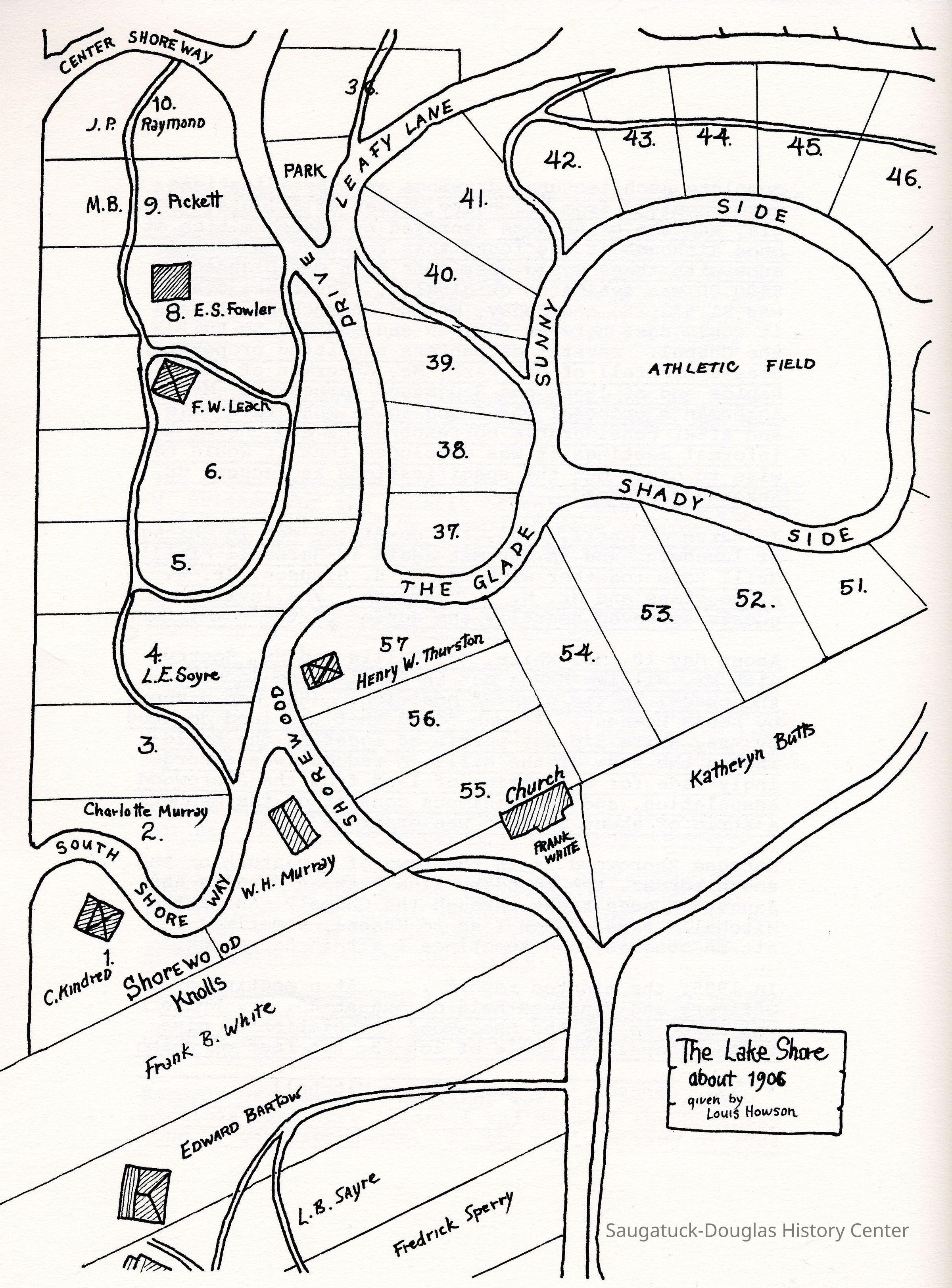 Hand-drawn map of Shorewood and Knolls listing the roads Center Shoreway, Shorewood Drive, Leafy Lane, The Glade, Sunny Side, Shady Side and South Shore Way. The Lakeshore Chapel is shown on the property of Frank White. Other property owners listed are J.P. Raymond, M.B. Pickett, E.S. Fowler, F.W. Leach, L.E. Sayre, Charlotte Murray, C. Kindred, Frank B. White, Edward Bartow, Fredrick Sperry, Katheryn Butts, and Henry W. Thurston.Collection