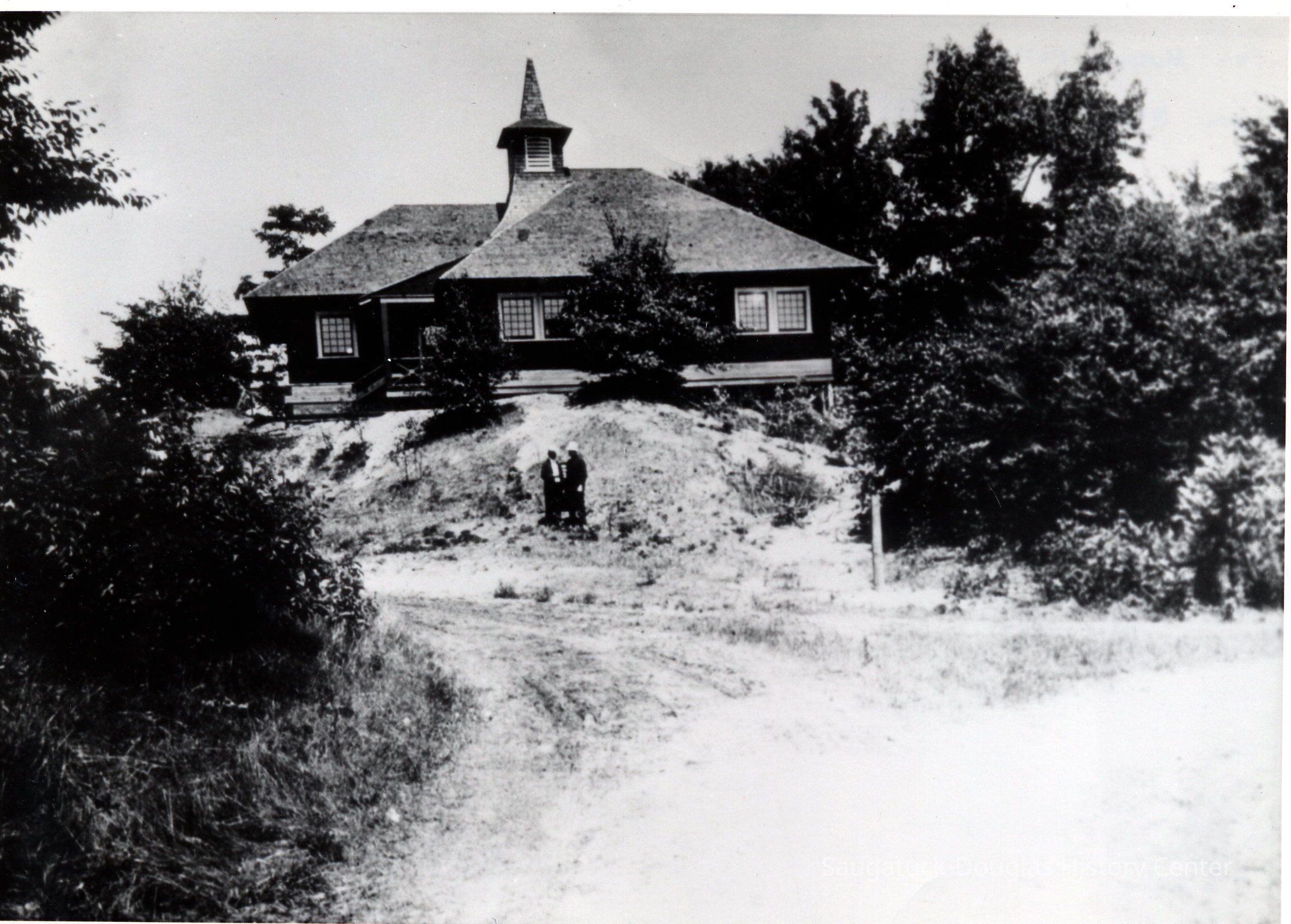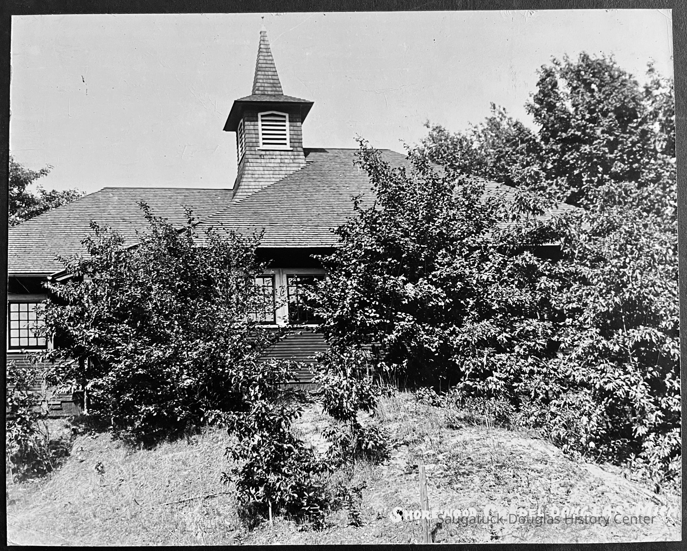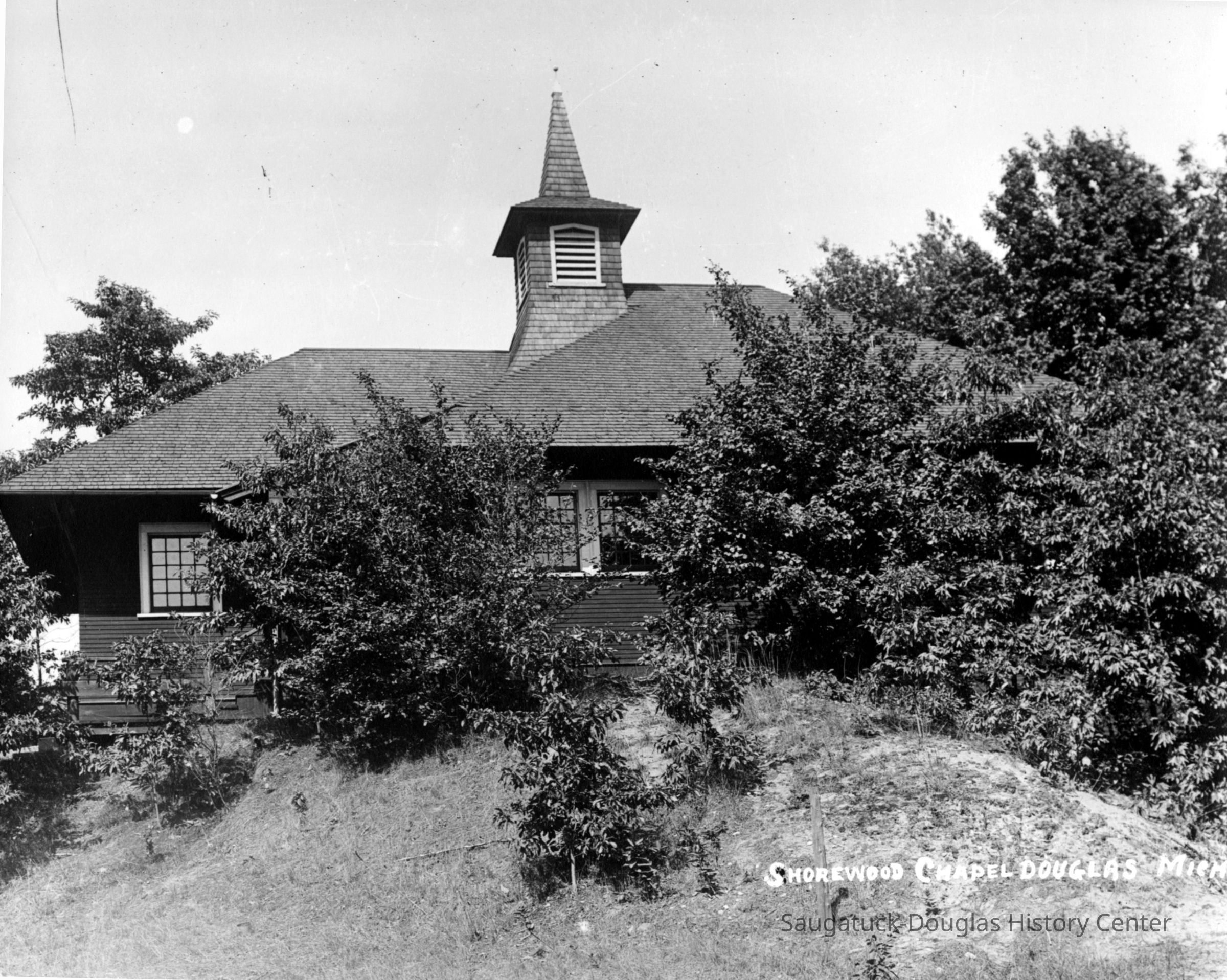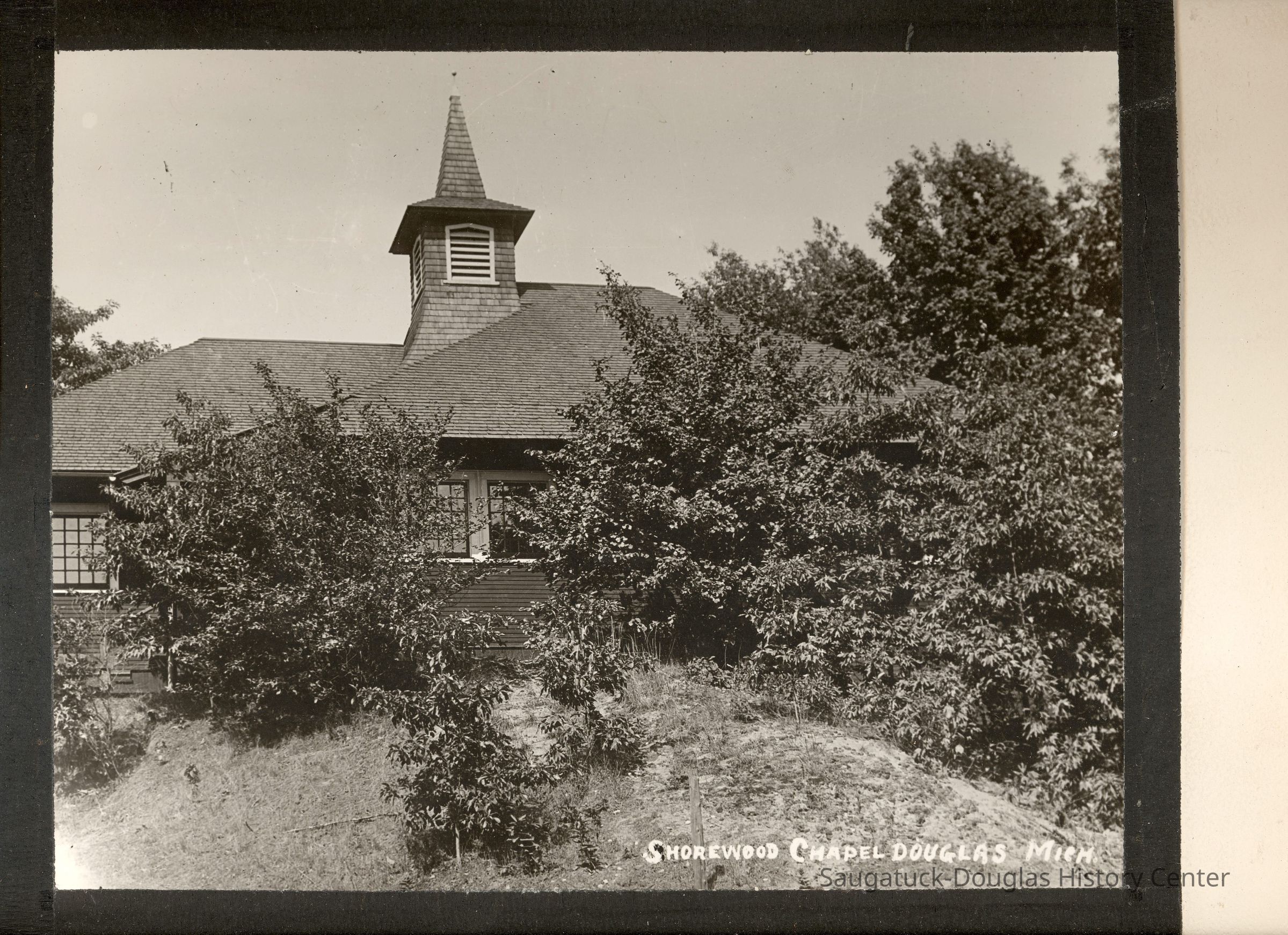 8x10 b/w photo of the Lake Shore Chapel with "Shorewood Chapel Douglas Mich" printed in white in the iamge, as was often done by the Simonson Studio. The photo is mounted on heavy black card. The photo includes the chapel spire and entry wing (south side) as the chapel would look if standing where Lakeshore Drive turns into Campbell Road. The building is obscured by dense shrubbery with few trees blocking out the sky.Photograph Details