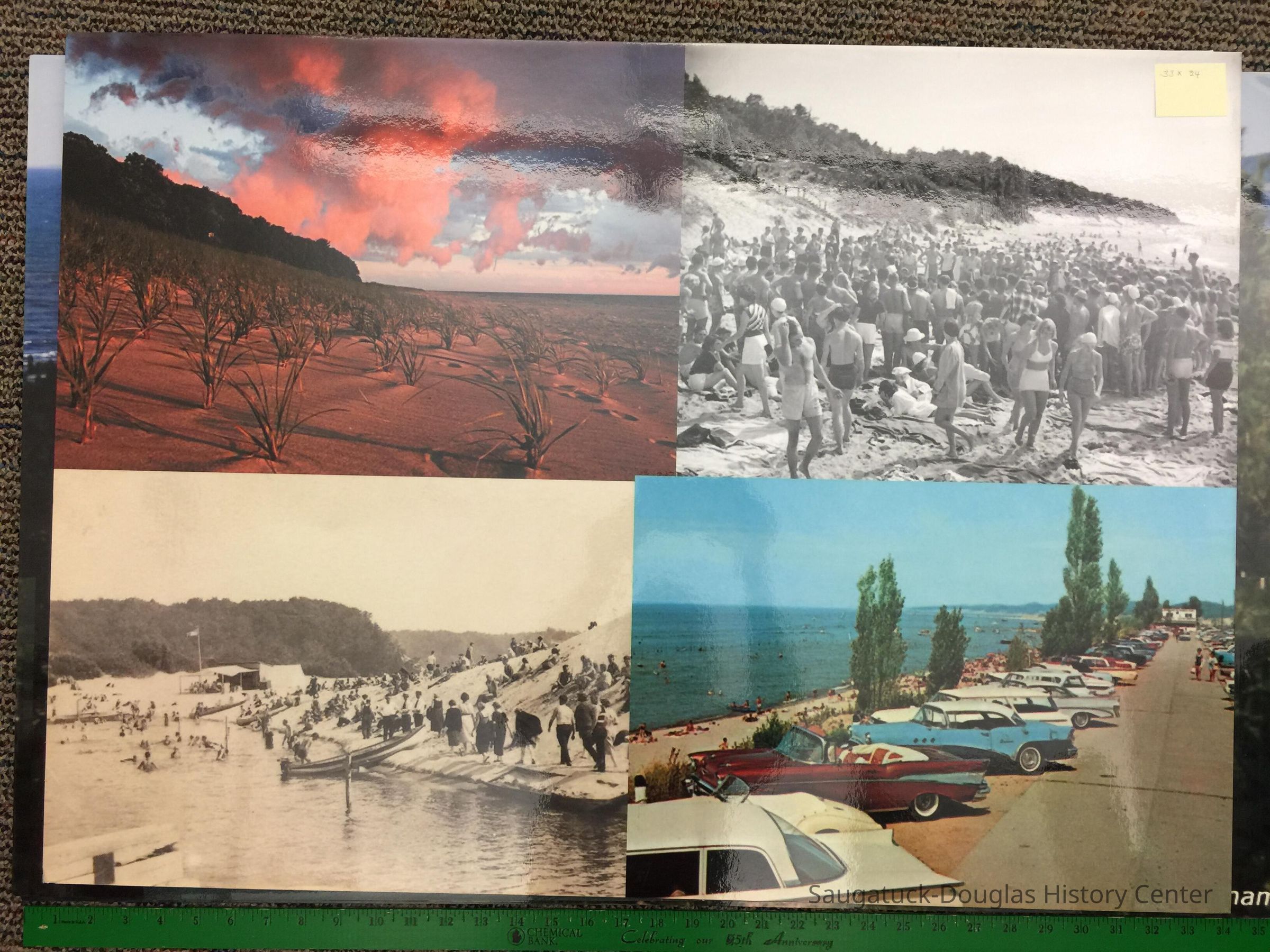 4. Montage of dune grass at sunset, mid-century crowd at Oval Beach, circa 1930s crowds at turning basin beach, mid-century cars parked at Oval Beach