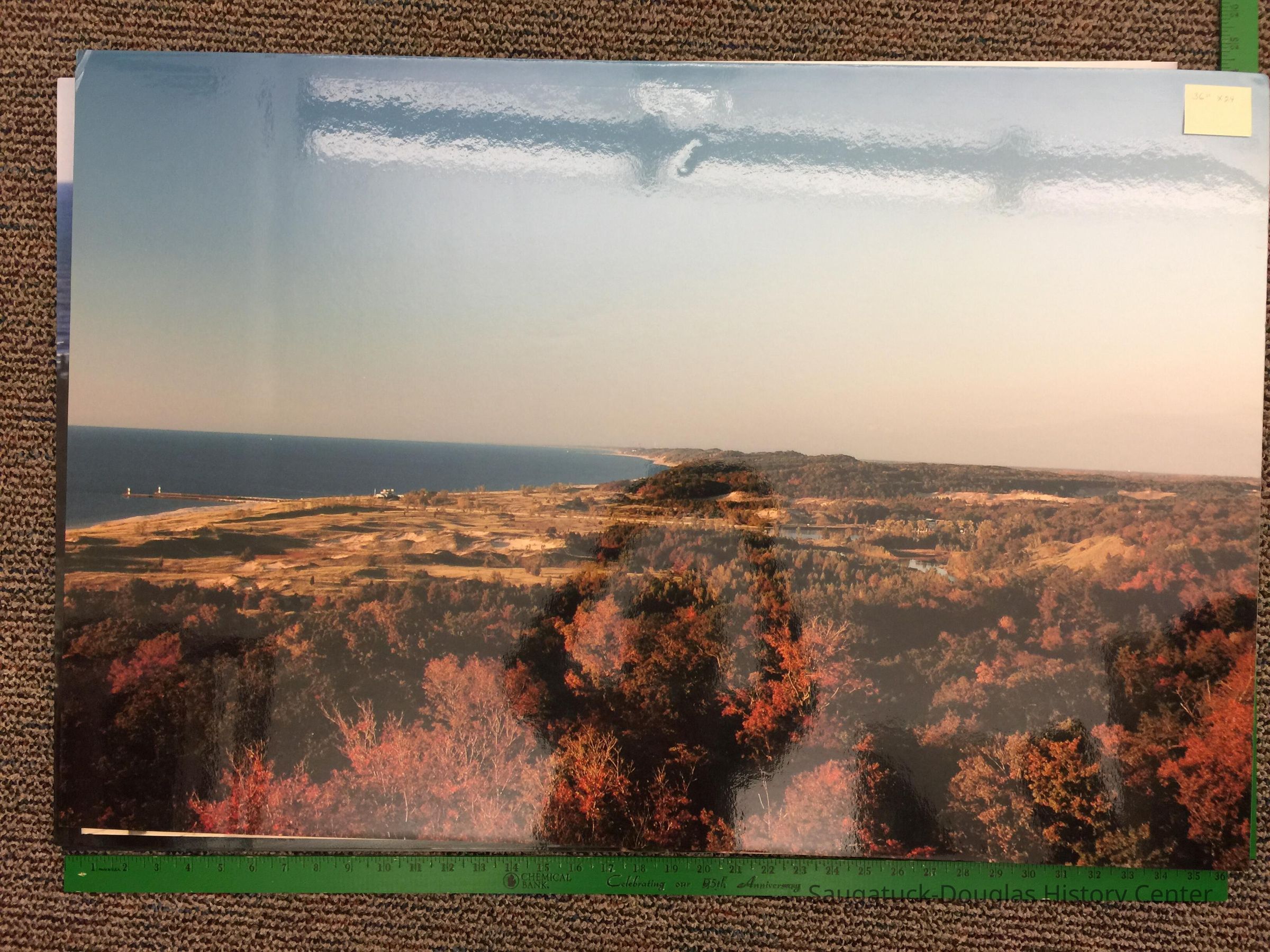 Five poster-size, high-gloss photos of the lake shore mounted on white foam board.