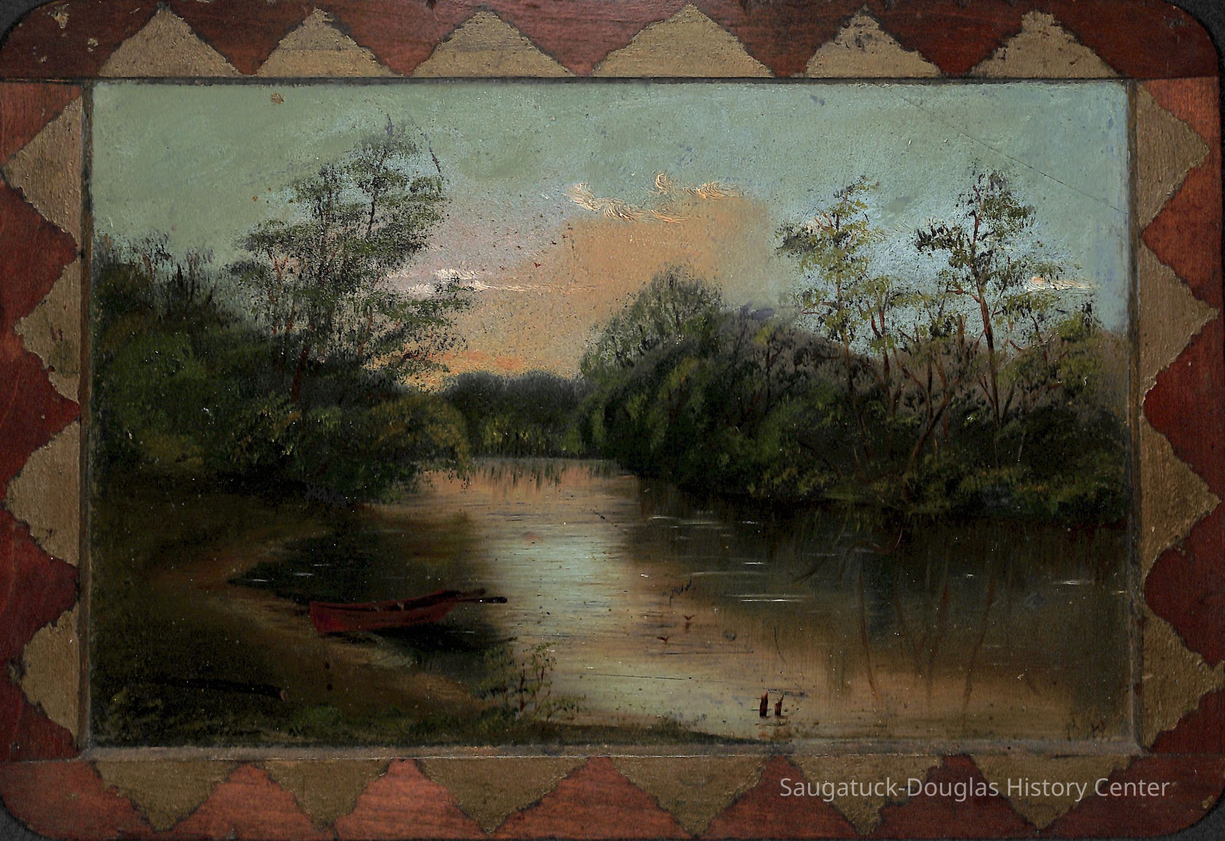 Landscape of river scene and trees in background. A rowboat in the middle ground. Likely dunes in background. The painting of a river and trees on the reverse side was probably executed in the 1880s.